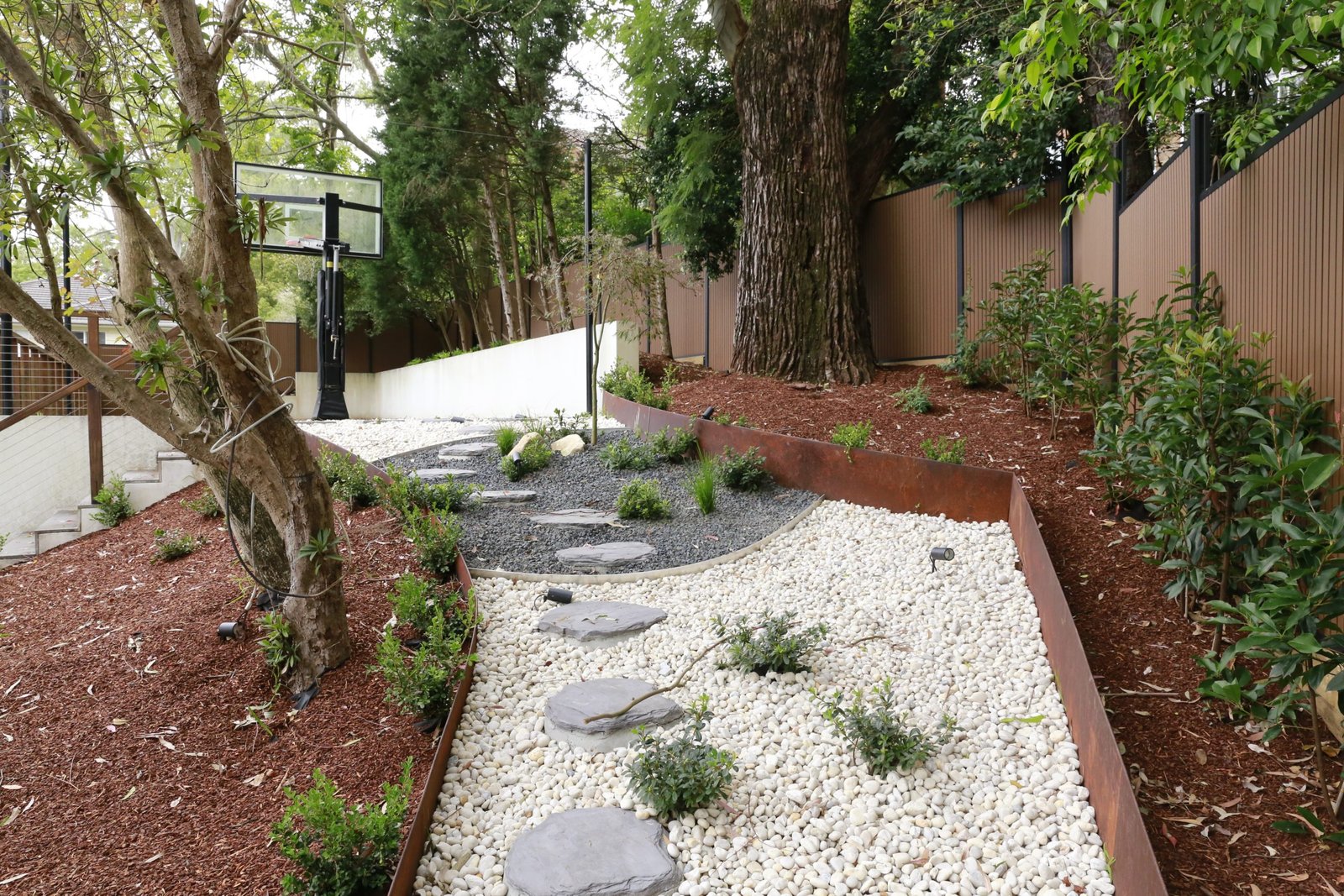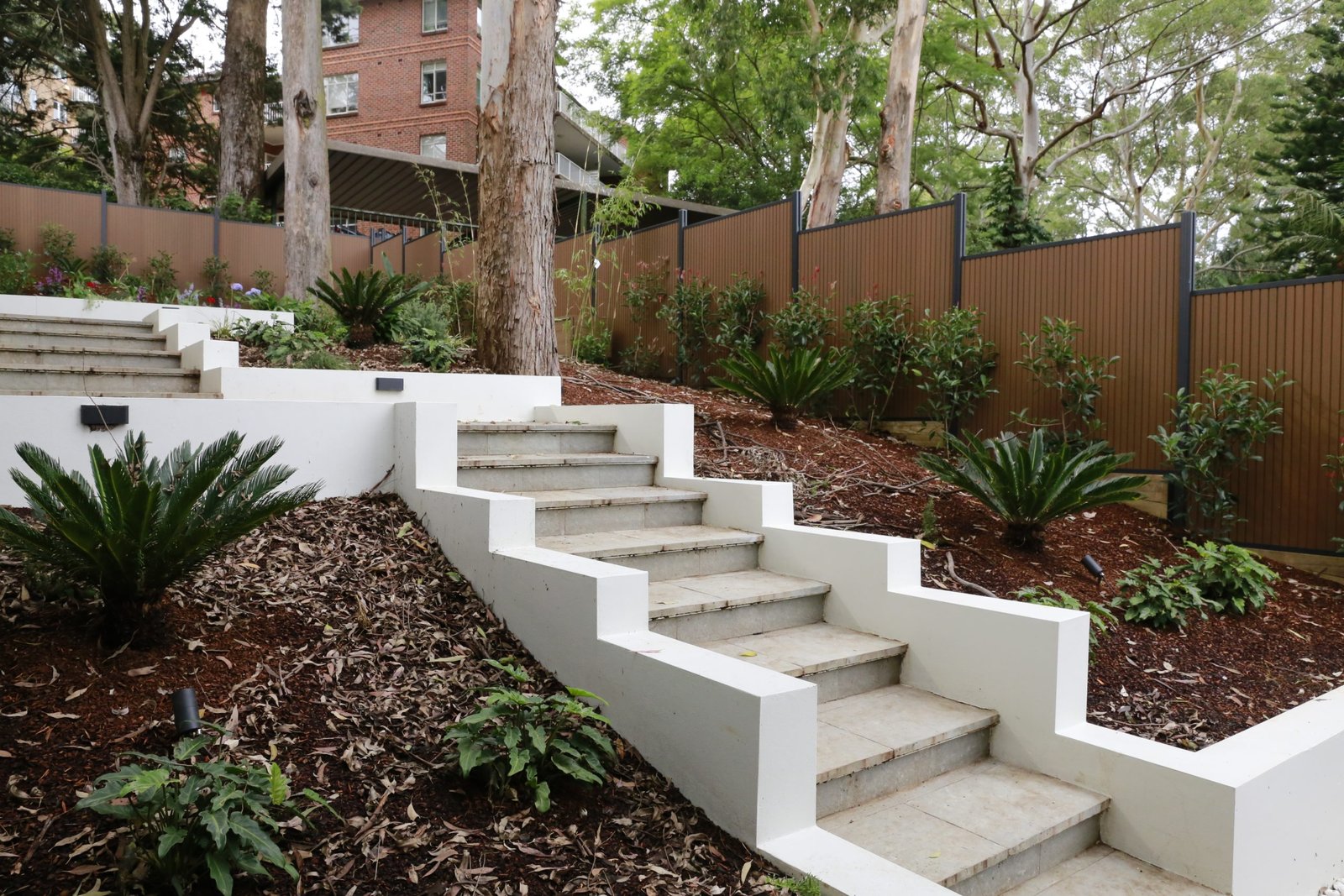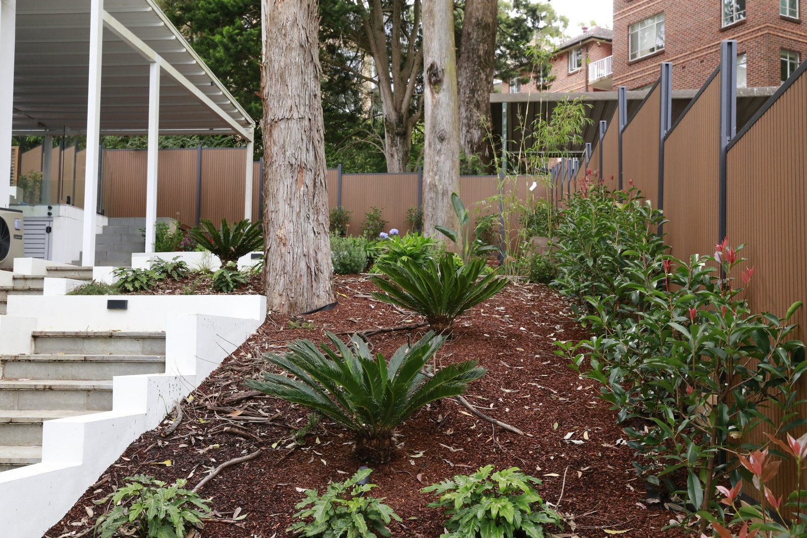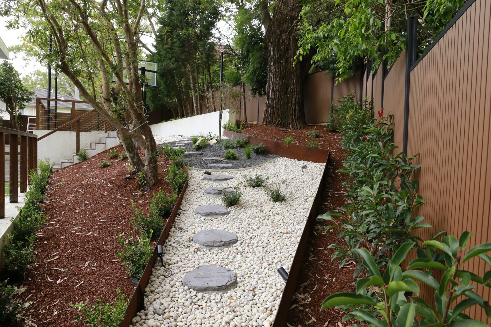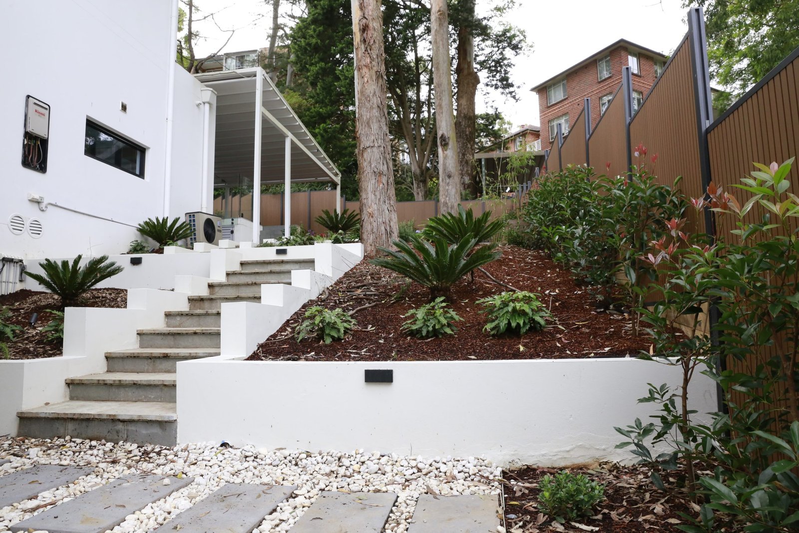 Awarded in the Sydney Design Awards, this Killara landscape construction transforms a steep site into tiered usable spaces while protecting valuable on-site trees.