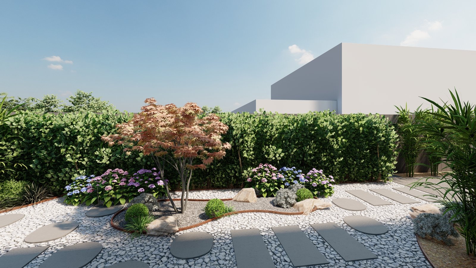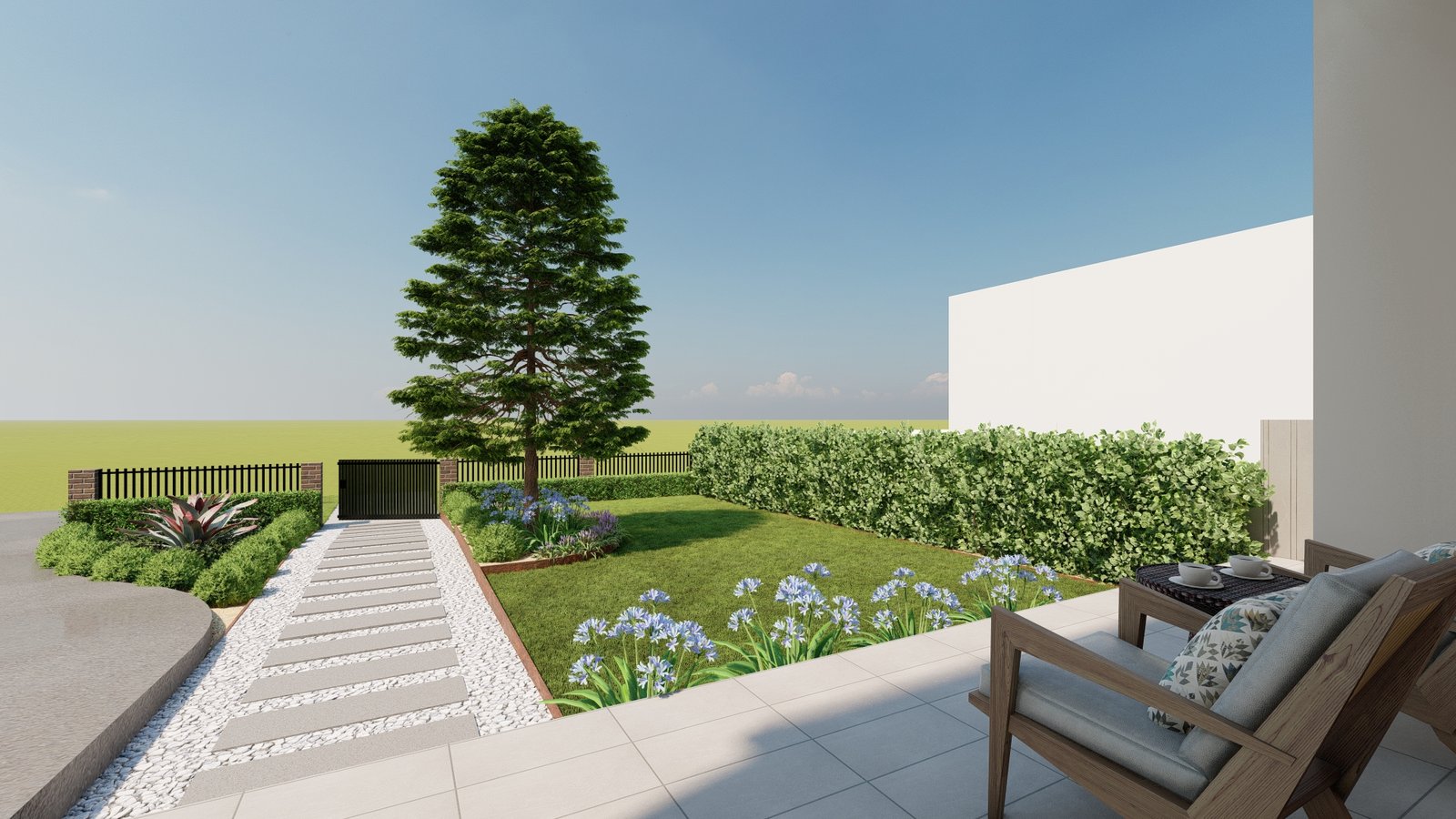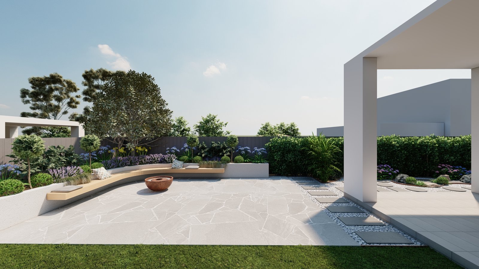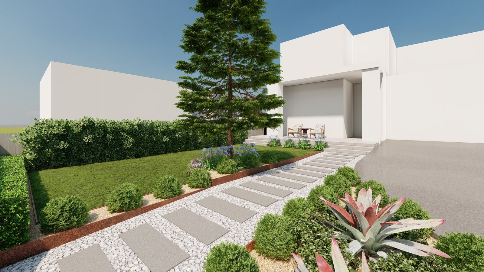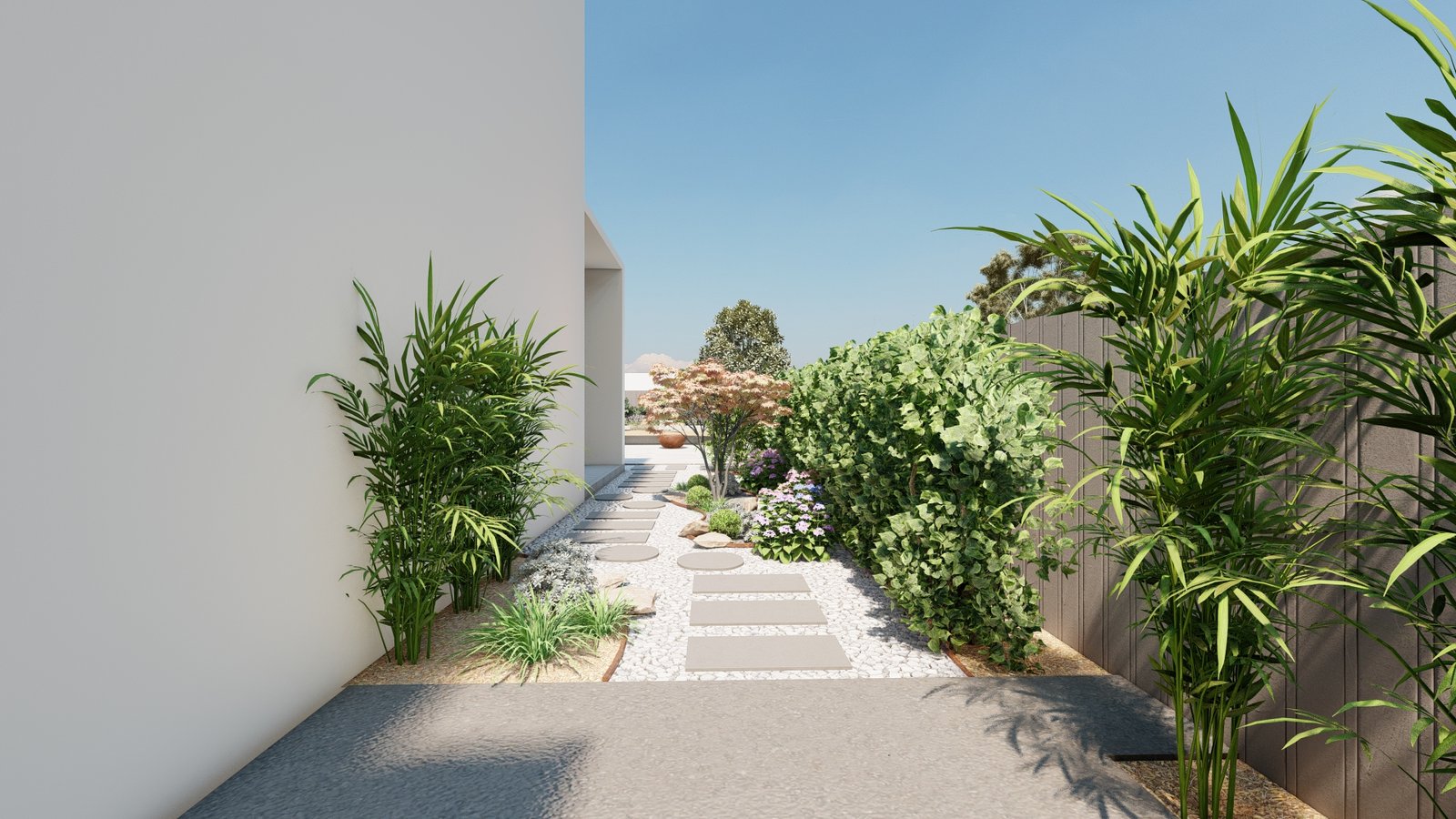 A contemporary landscape featuring a thoughtfully composed side path that enhances movement and atmosphere.