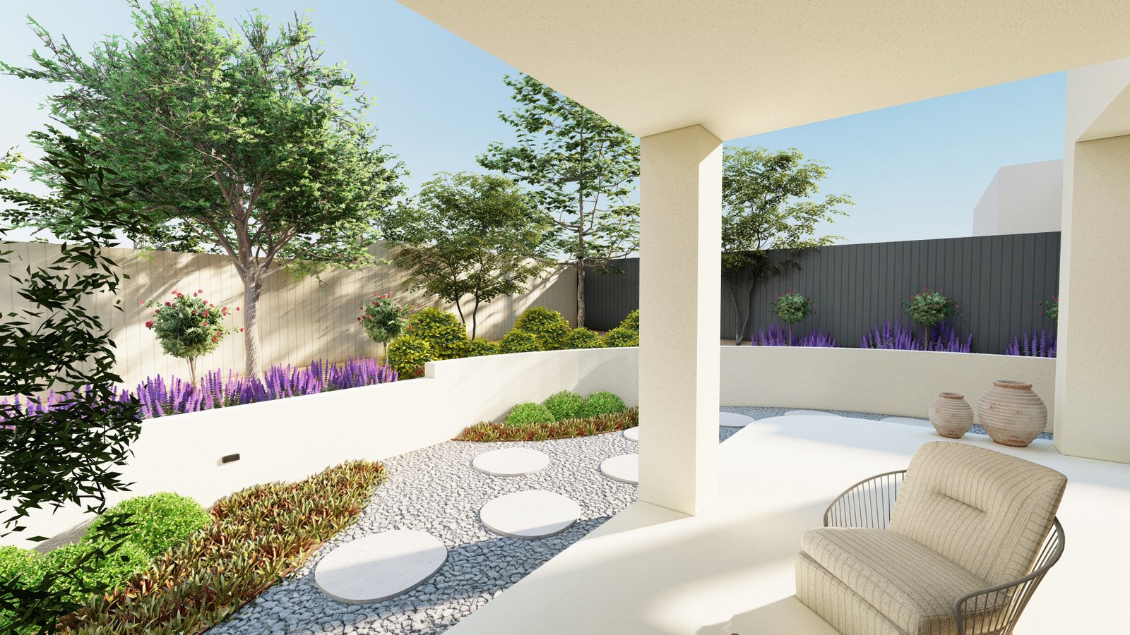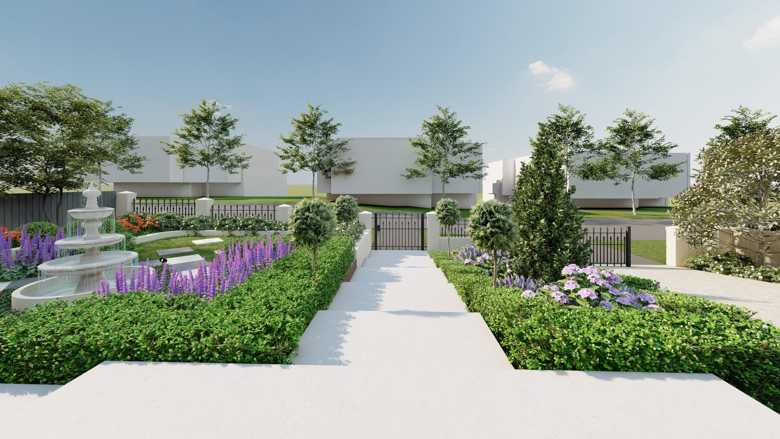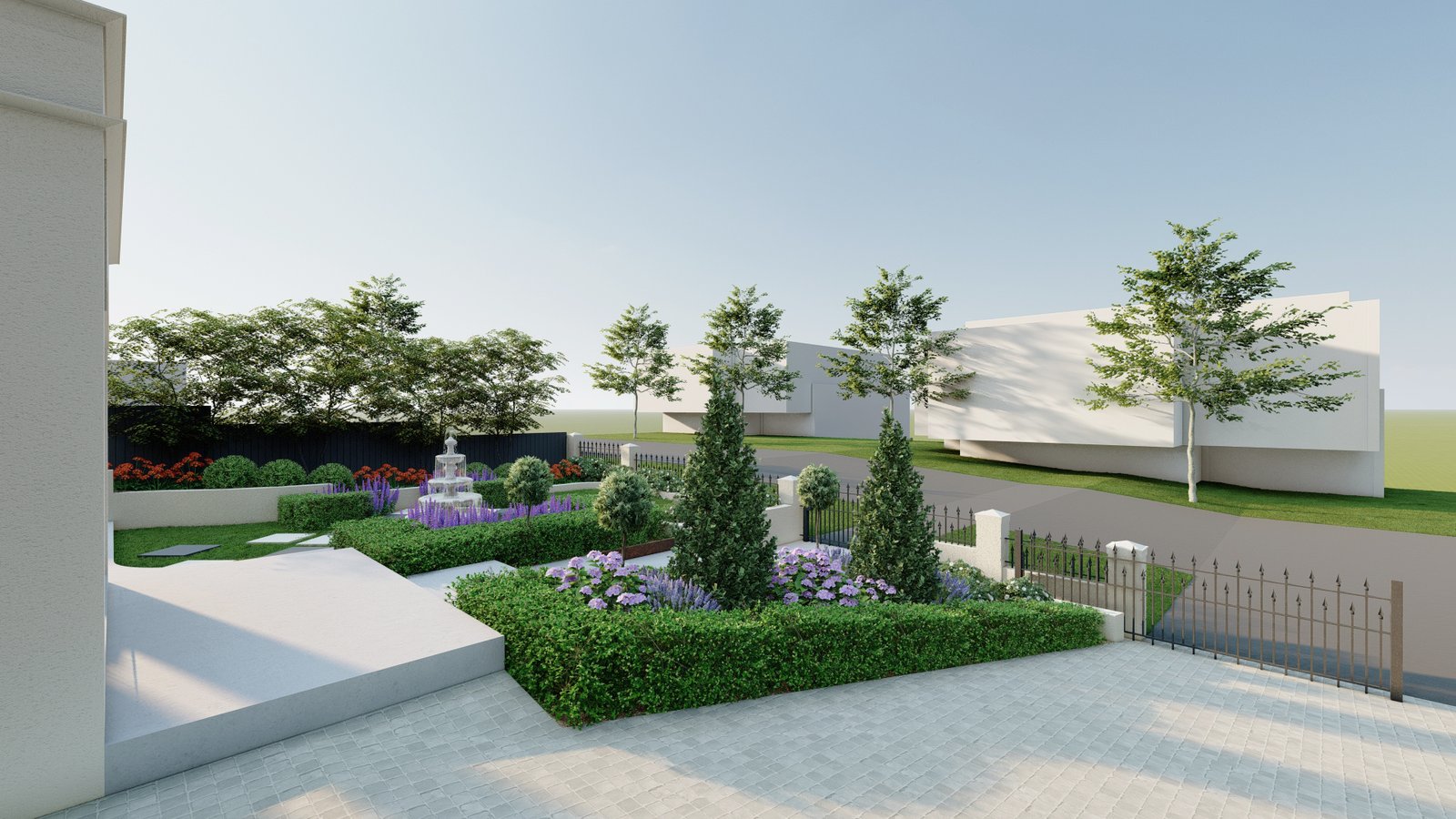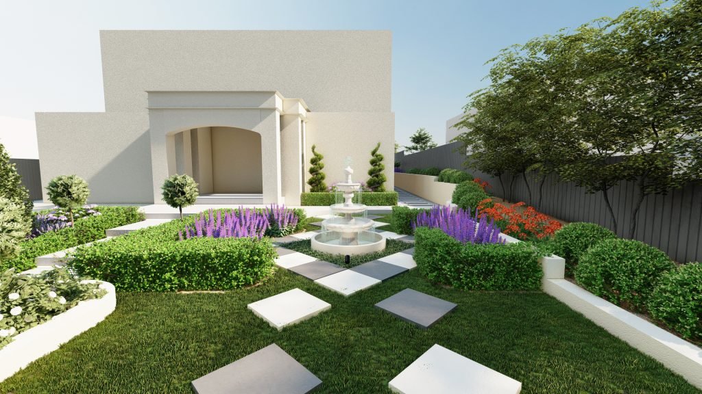 Designed in a French style, this Castle Hill landscape combines structured planting and classic materials to form an elegant and atmospheric outdoor environment.
