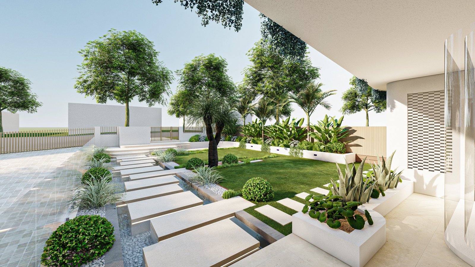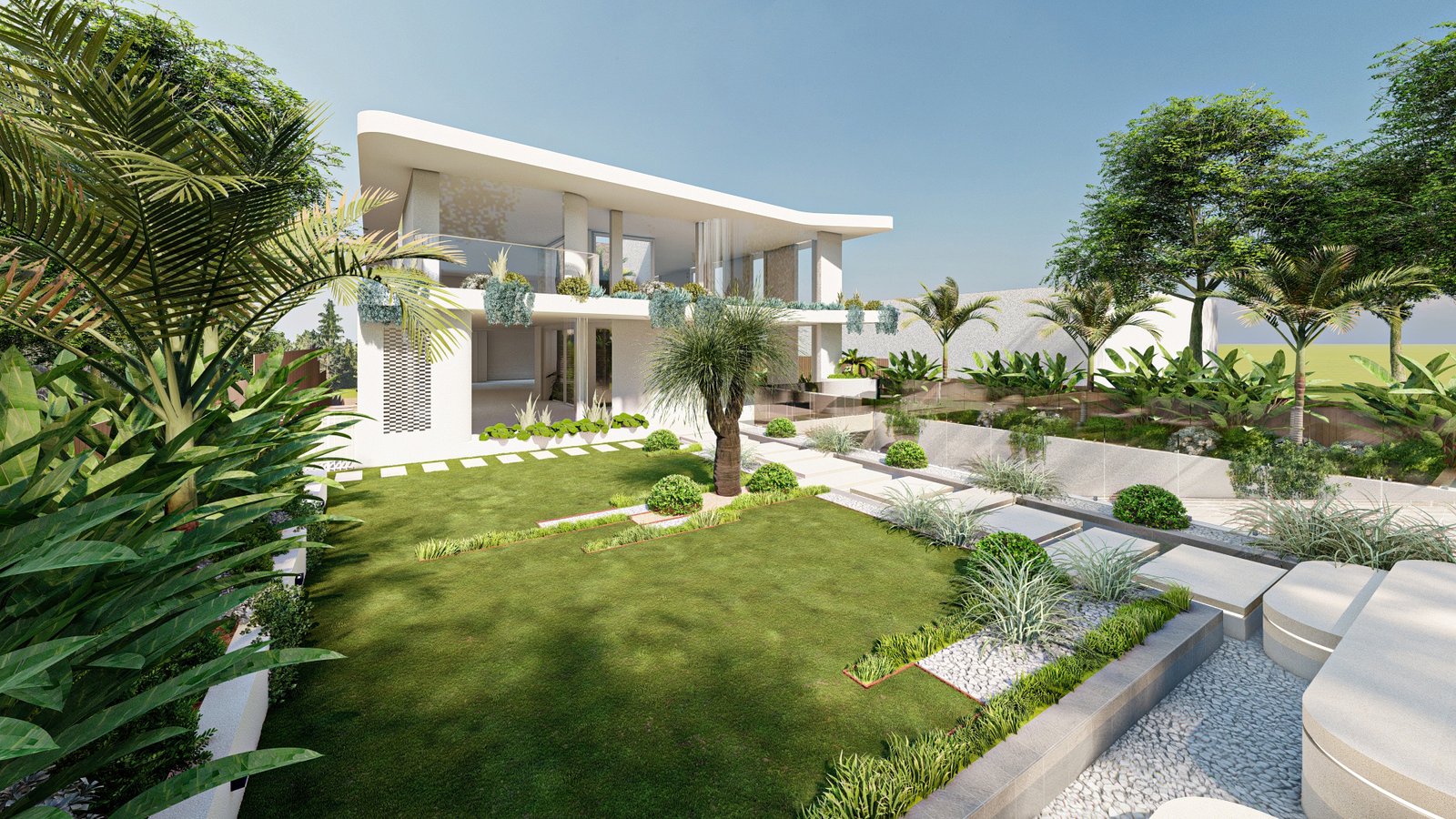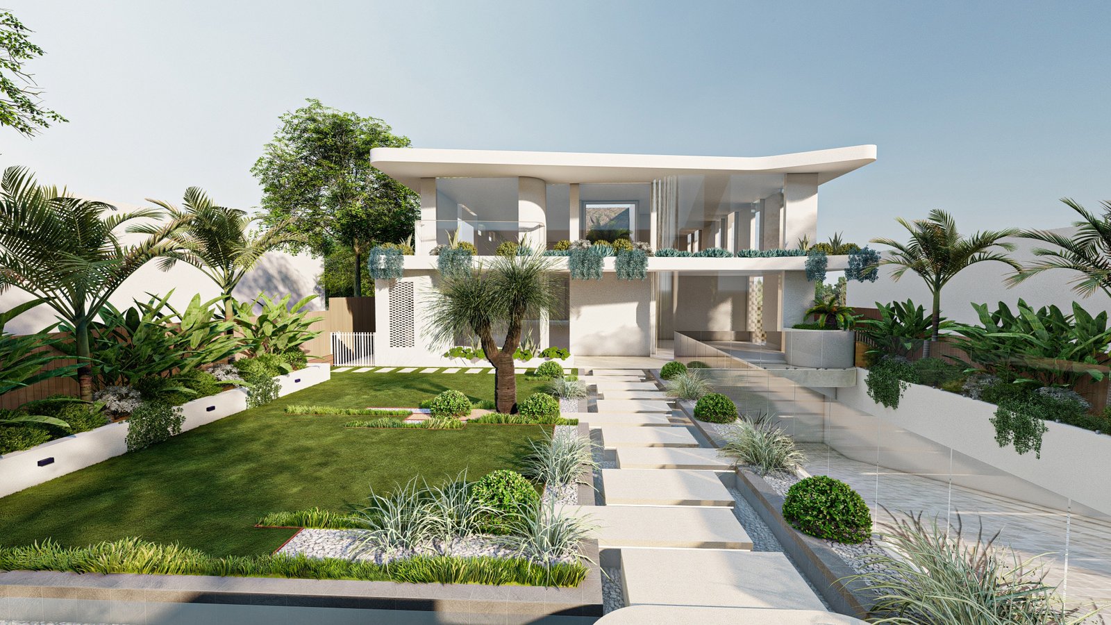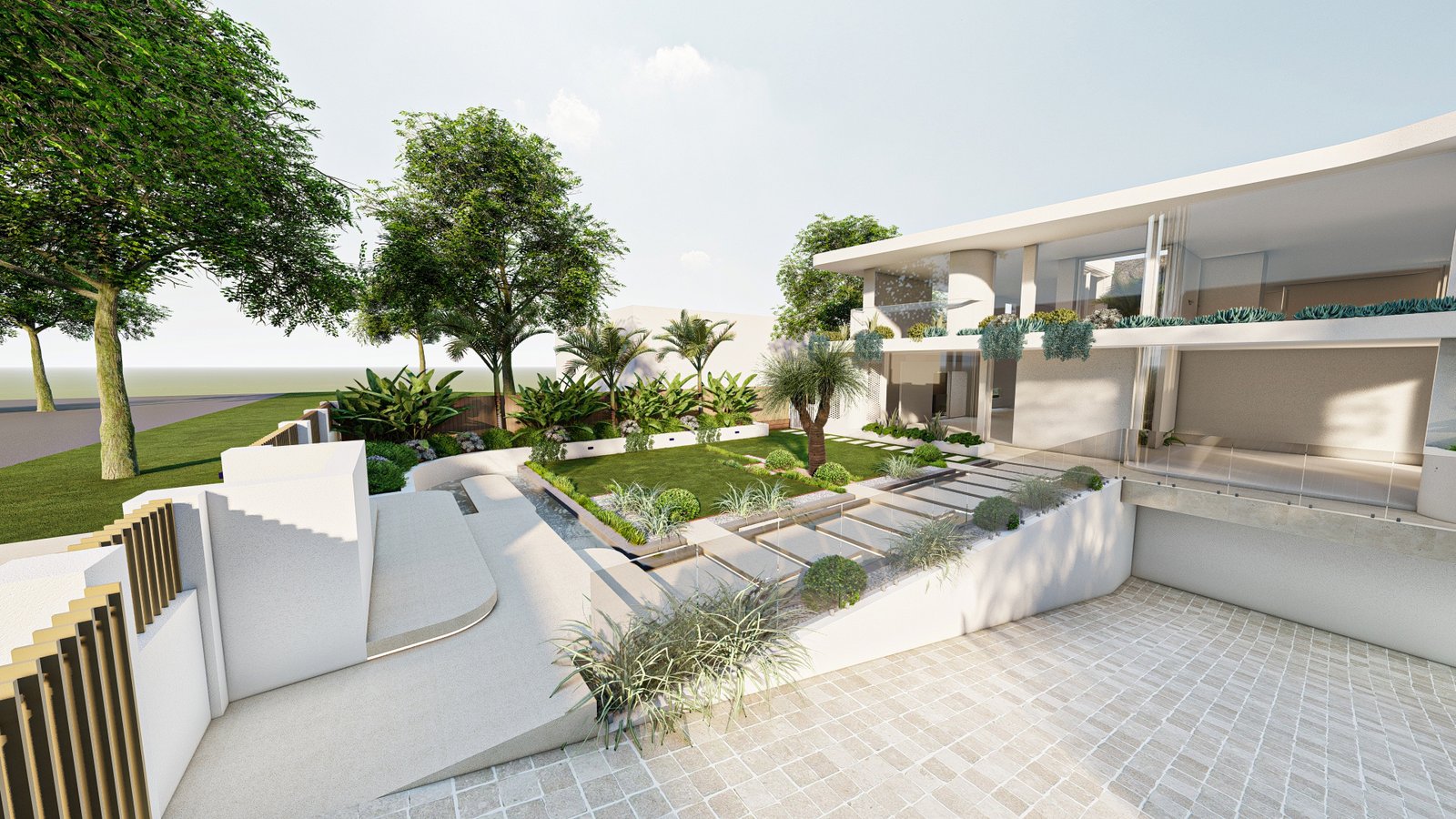 A French-inspired luxury landscape where terraced levels and layered planting respond to the site’s natural slope, creating a refined garden that enhances the grandeur of the residence.