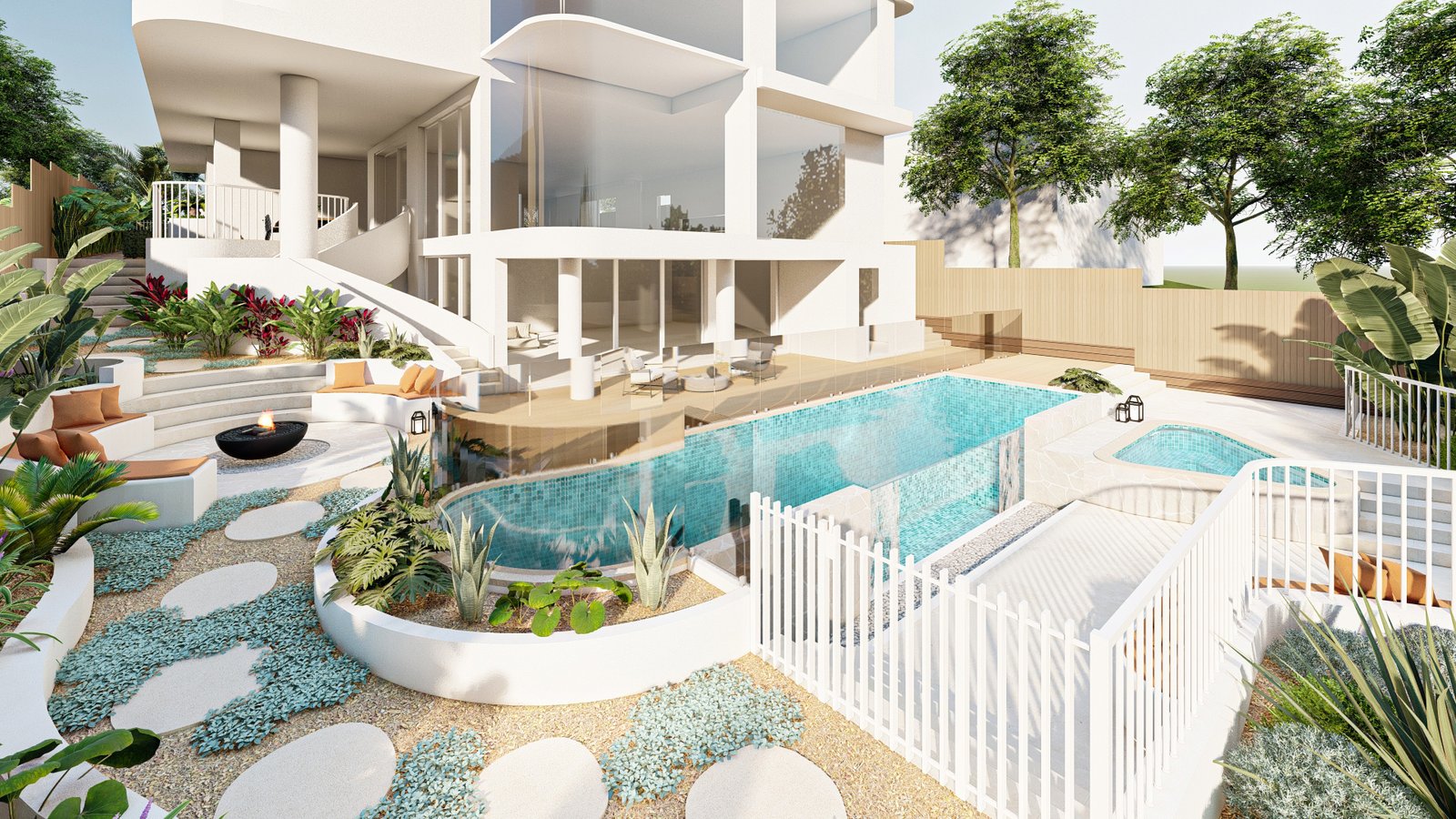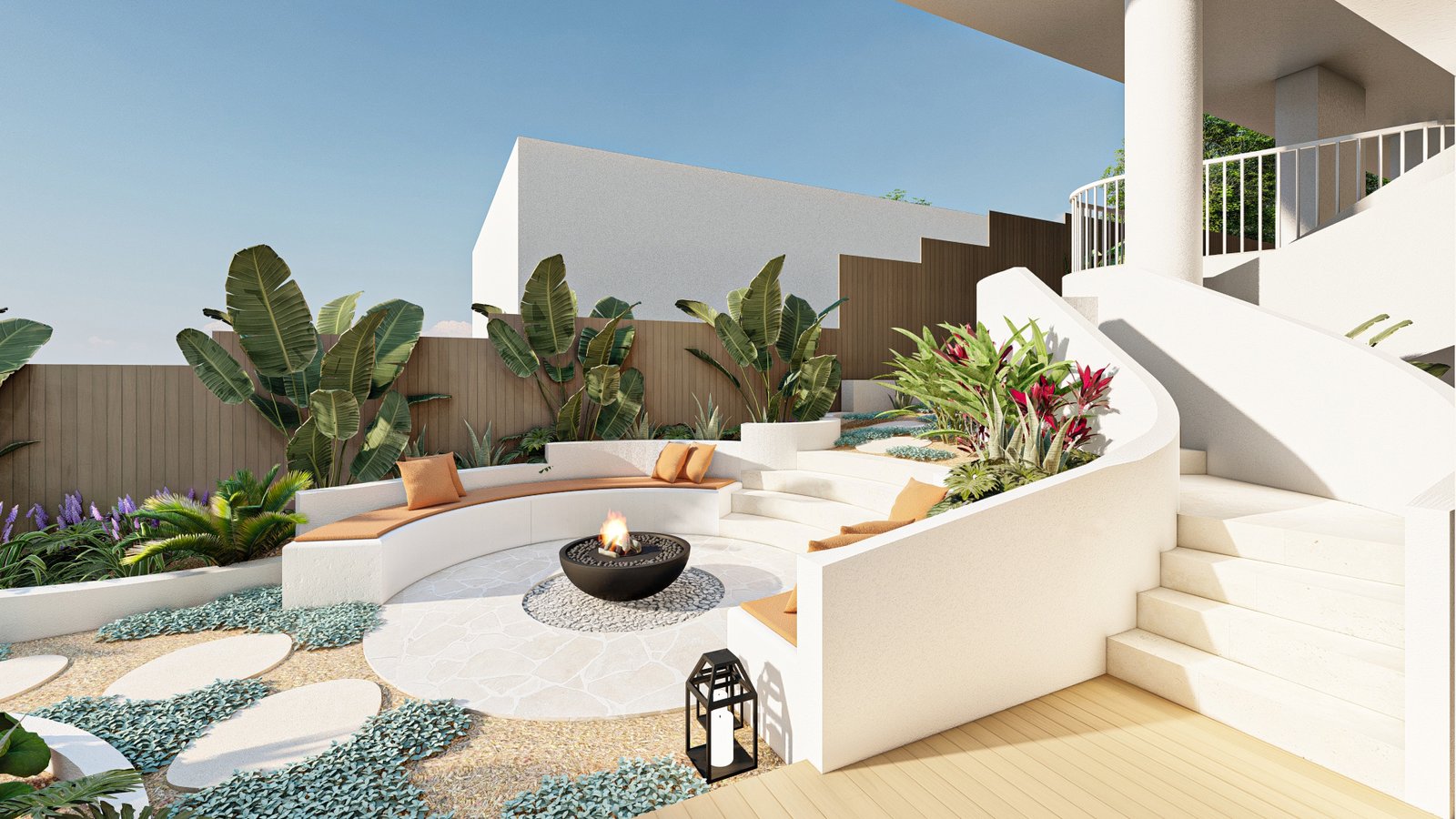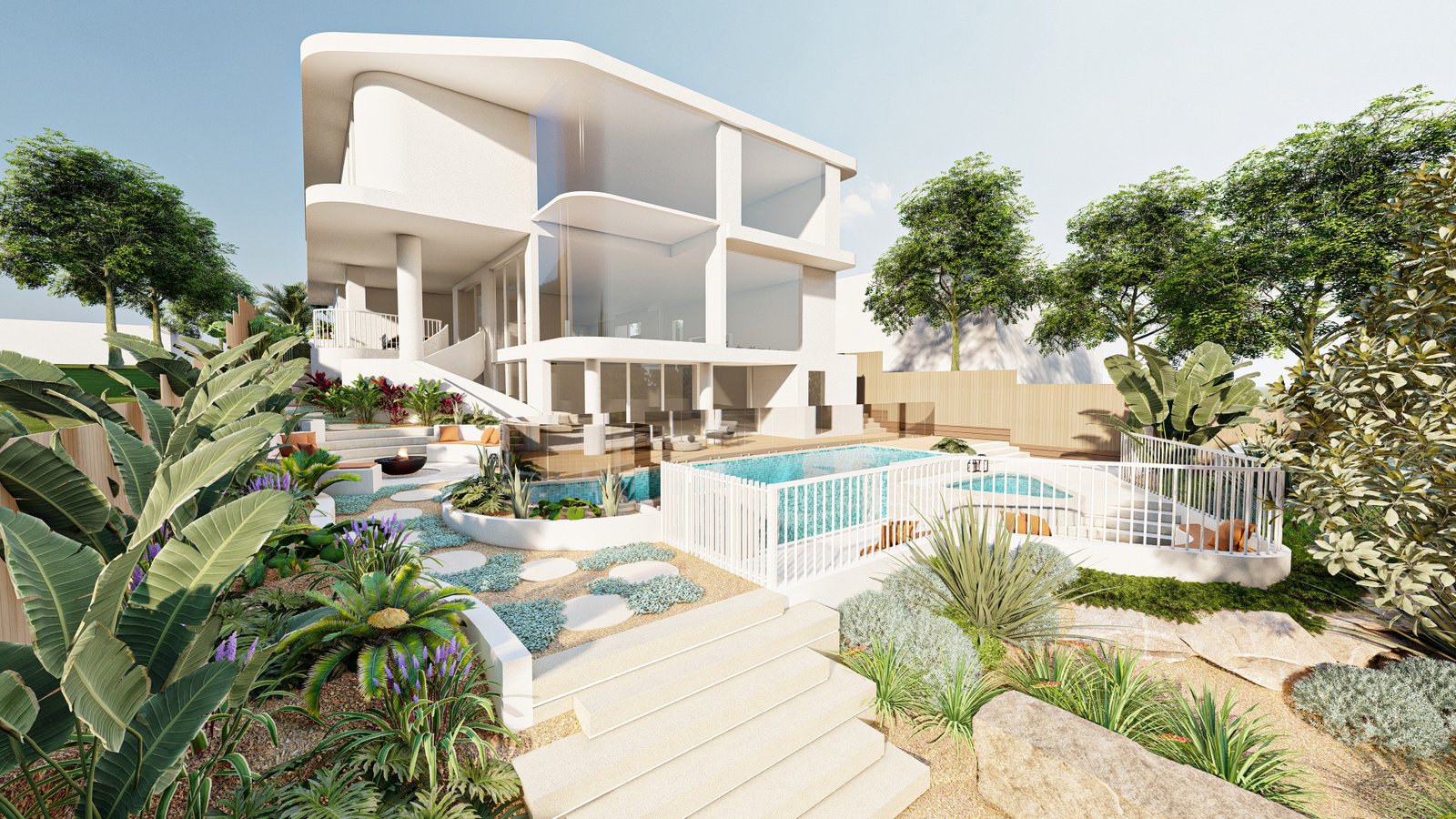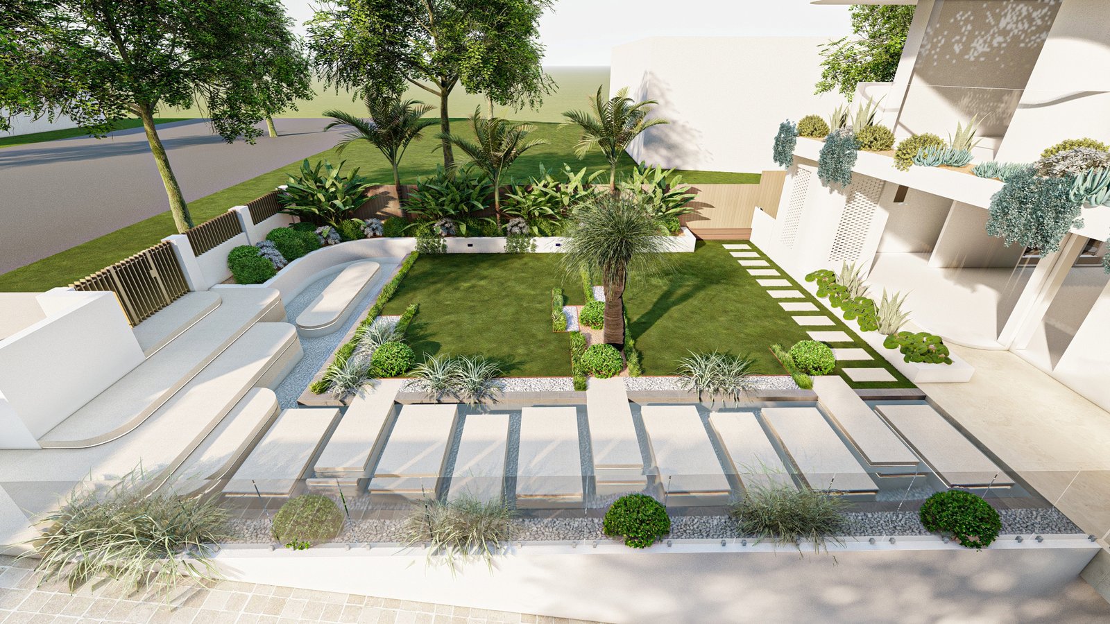 A French-inspired luxury landscape where terraced levels and layered planting respond to the site’s natural slope, creating a refined garden that enhances the grandeur of the residence.