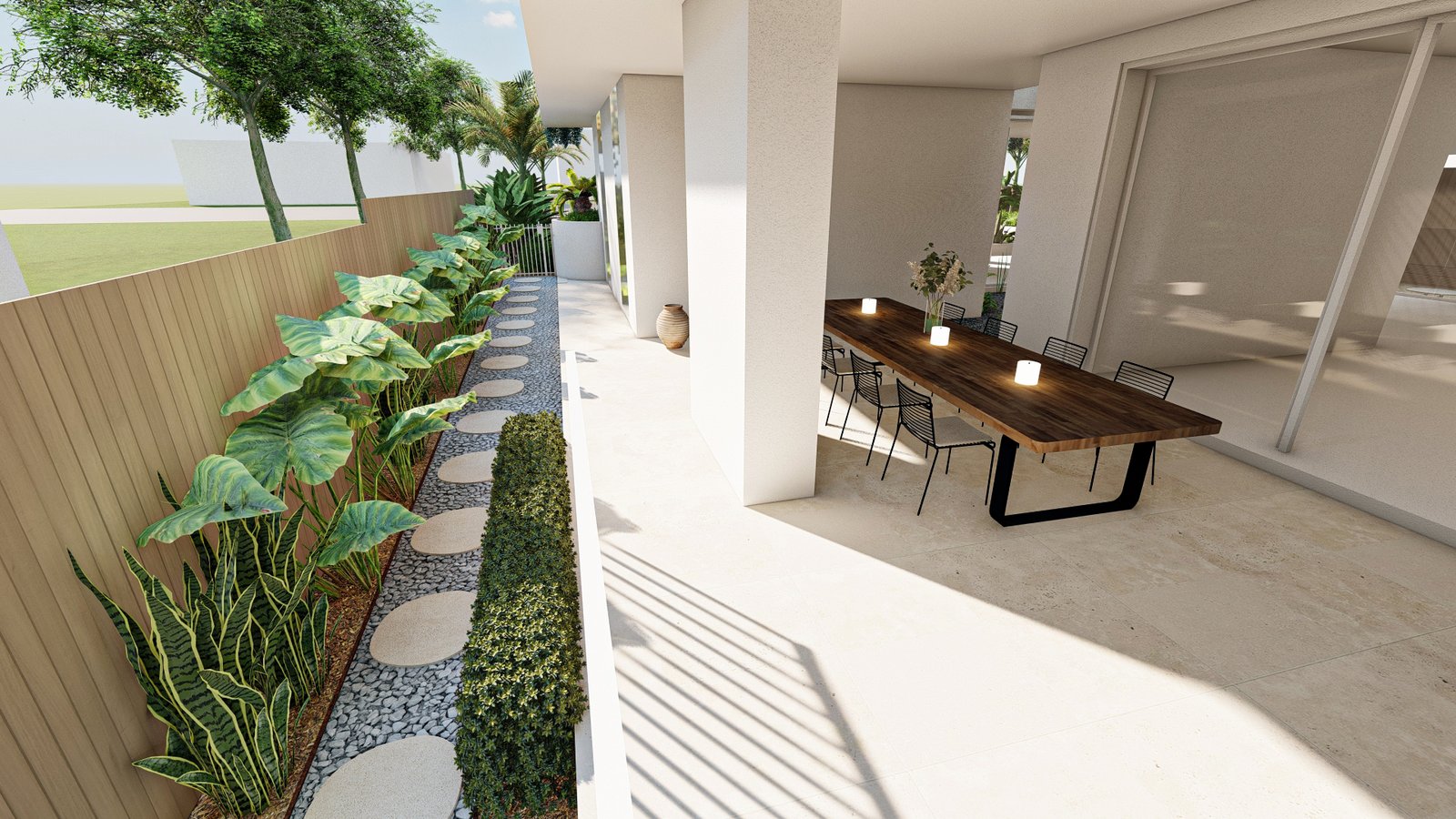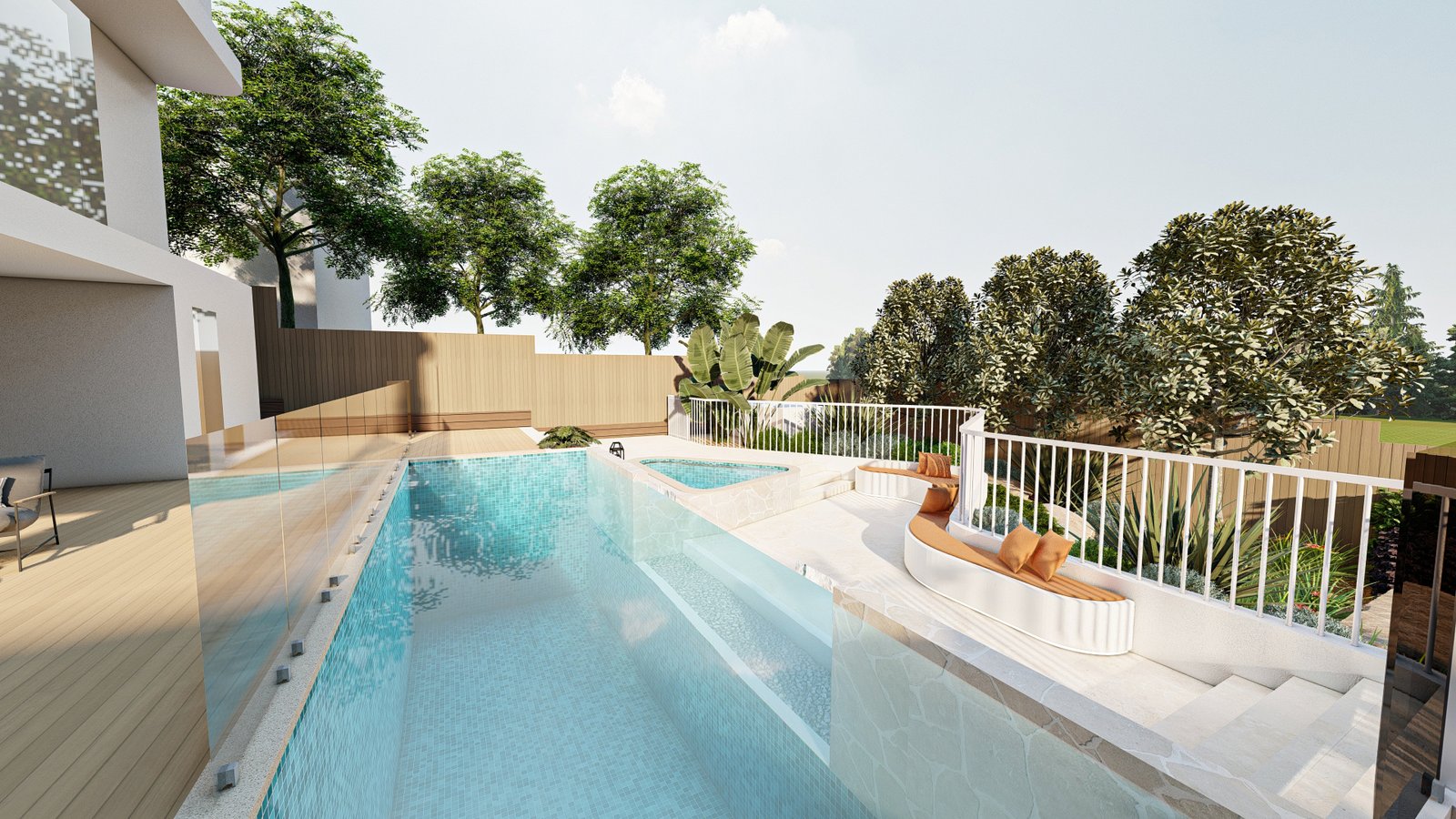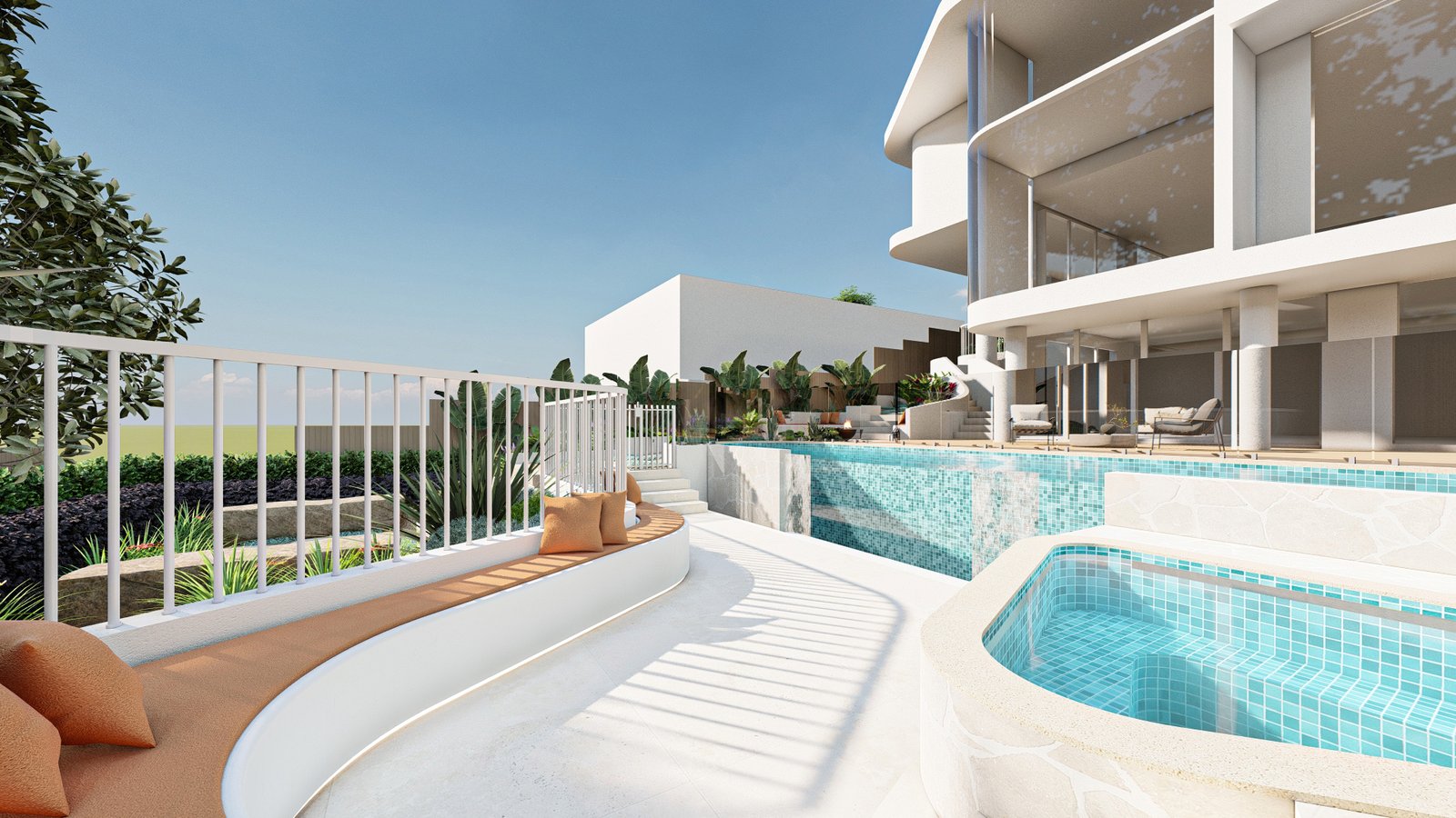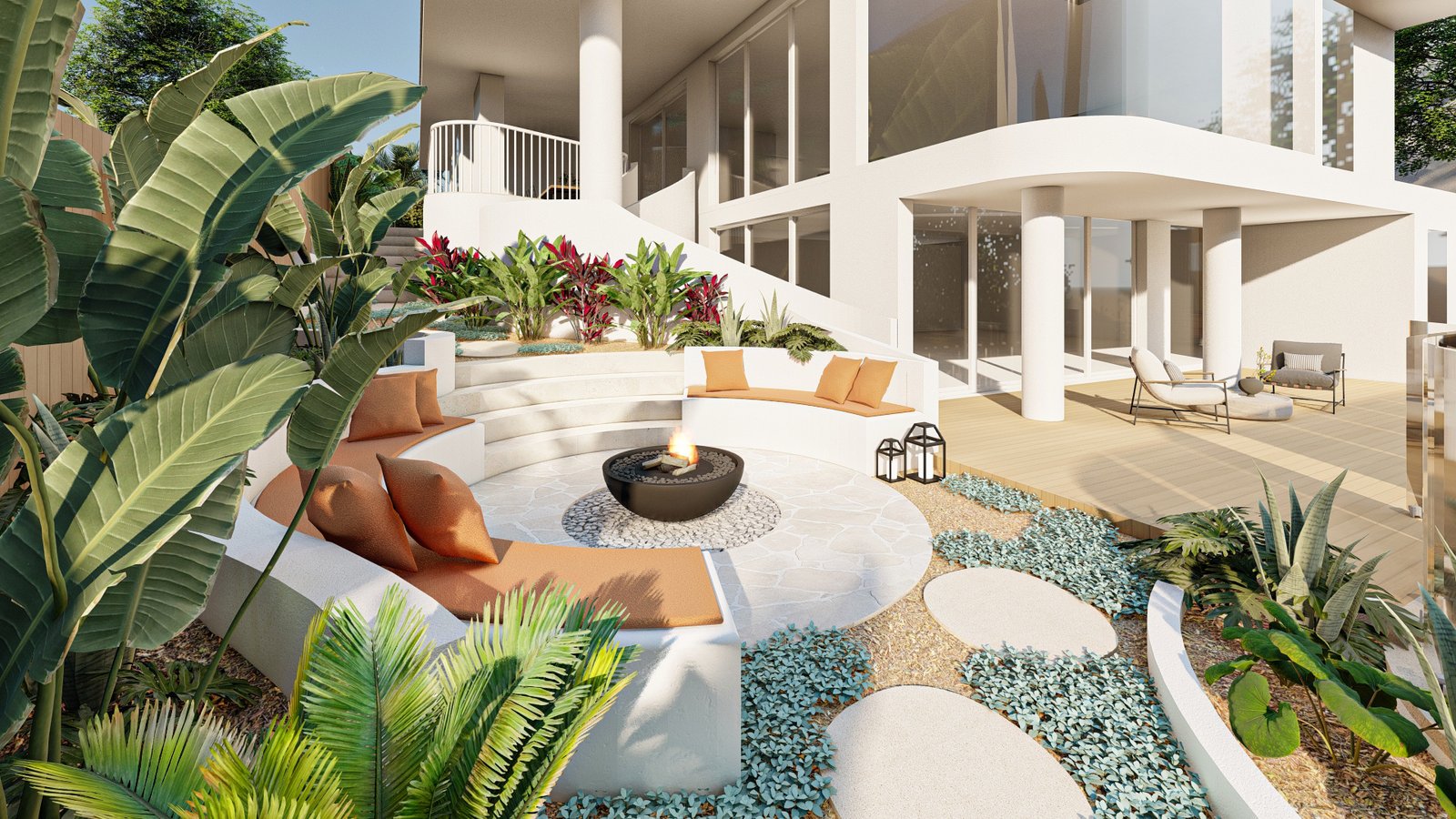 A French-inspired luxury landscape where terraced levels and layered planting respond to the site’s natural slope, creating a refined garden that enhances the grandeur of the residence.