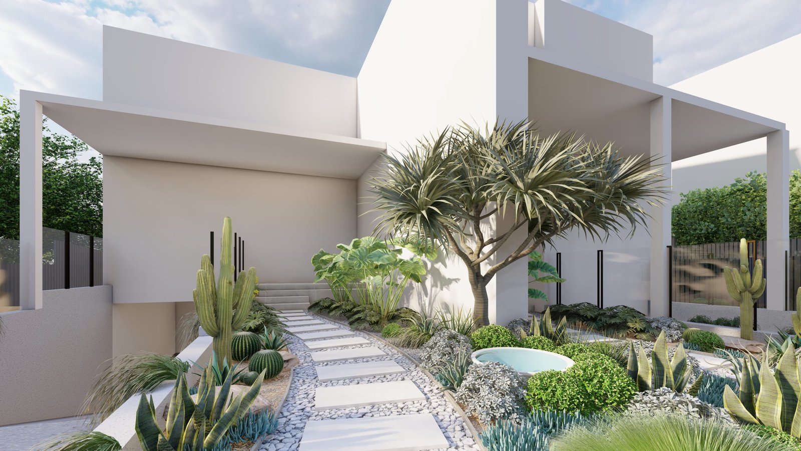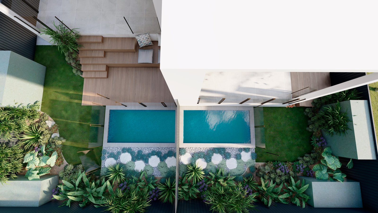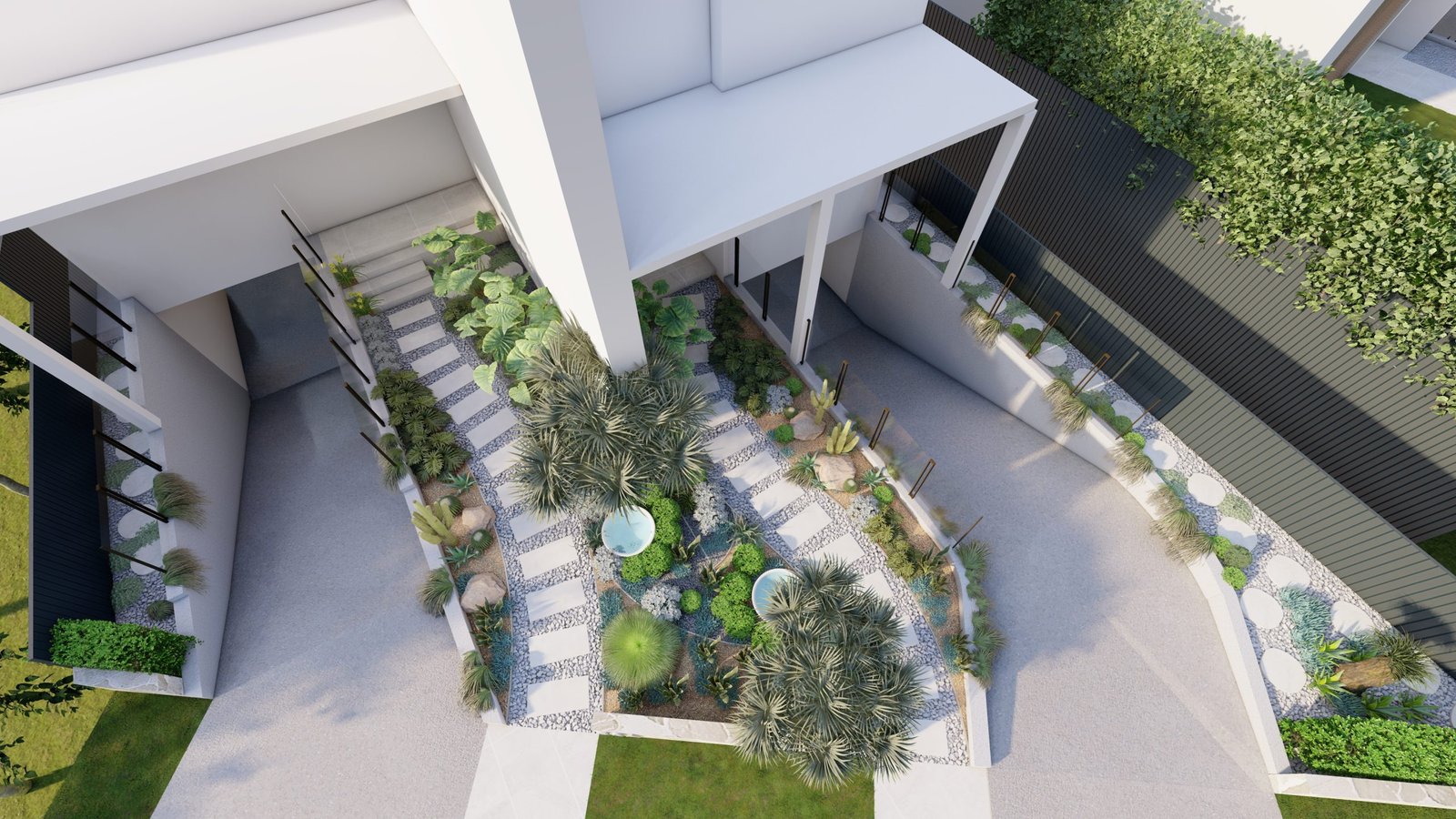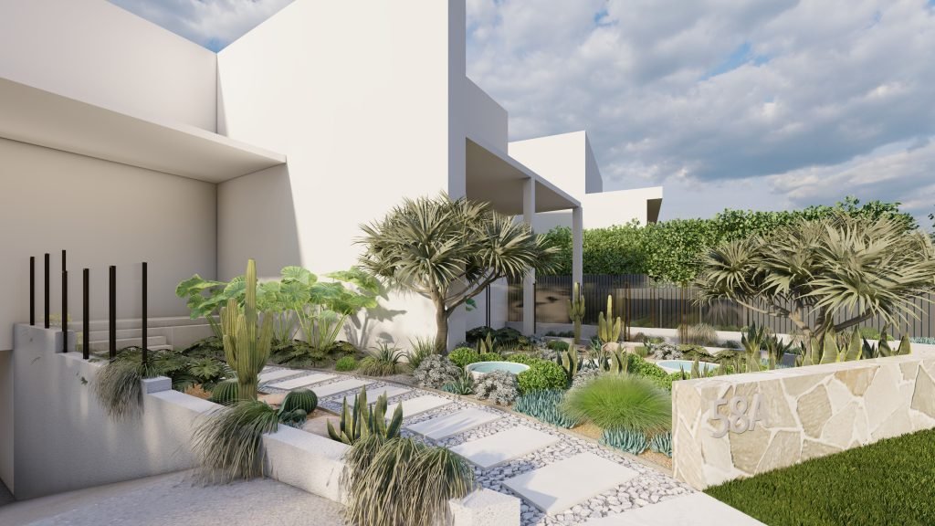 A Mediterranean-inspired duplex landscape that evokes a relaxed resort-like atmosphere with lush tropical planting and warm materiality.