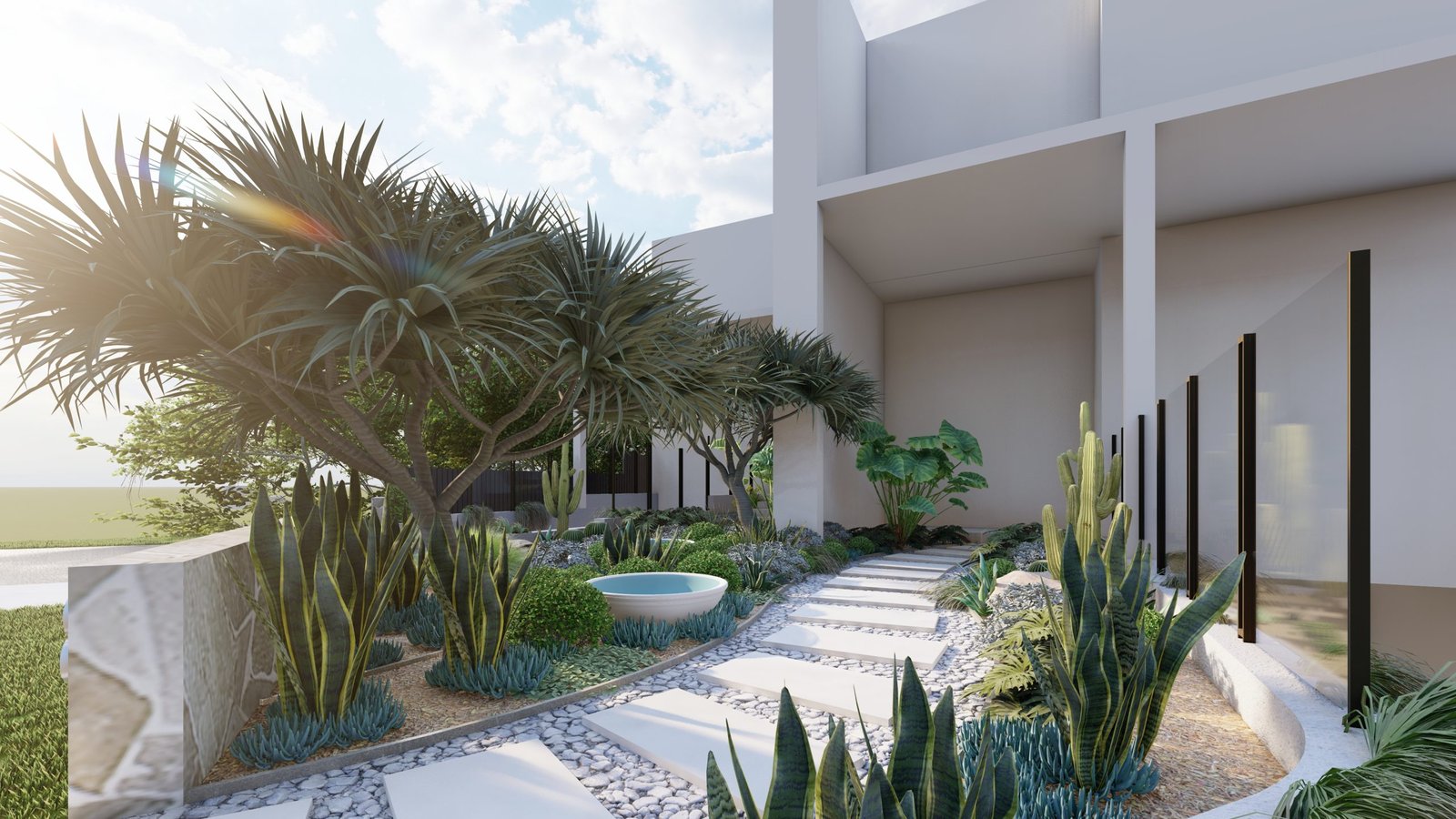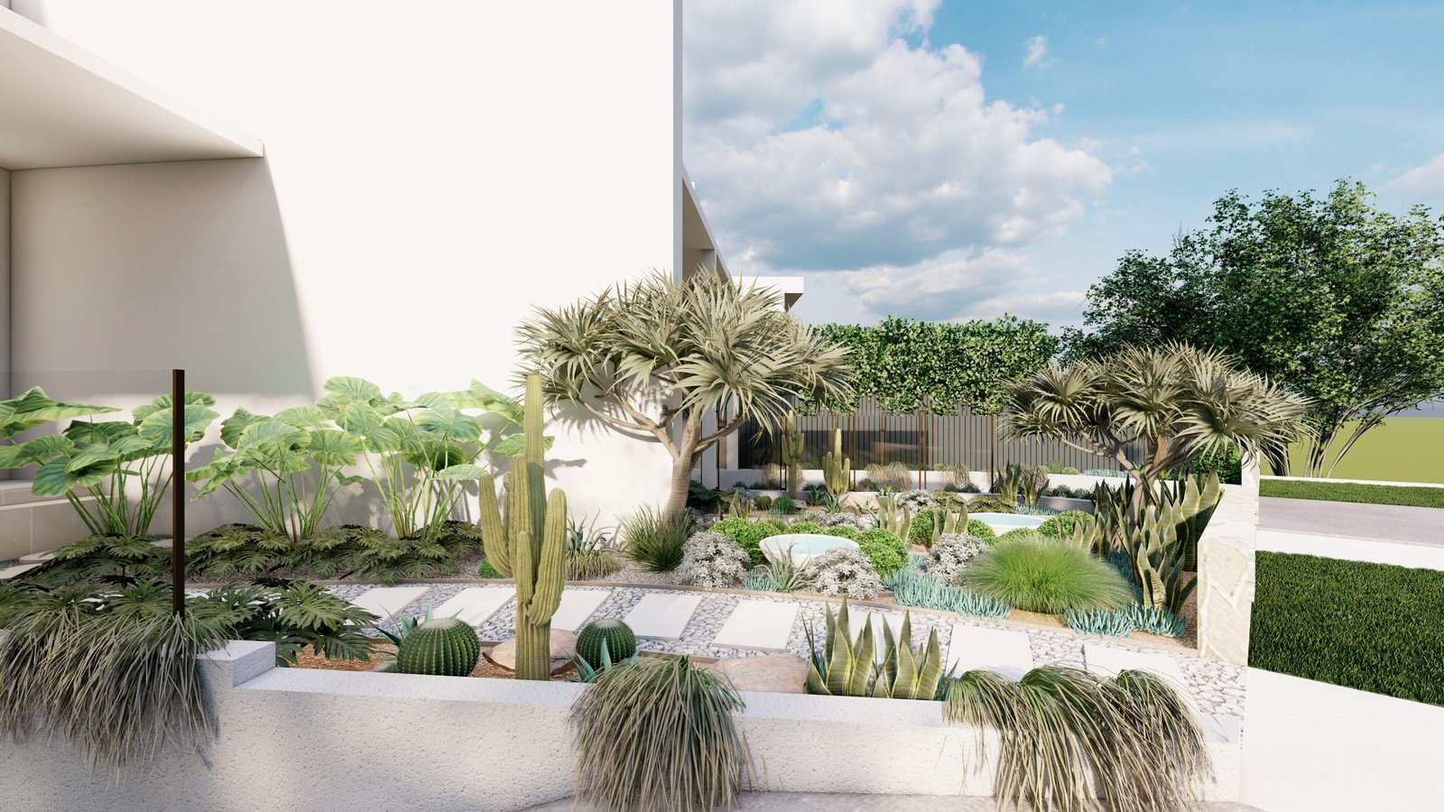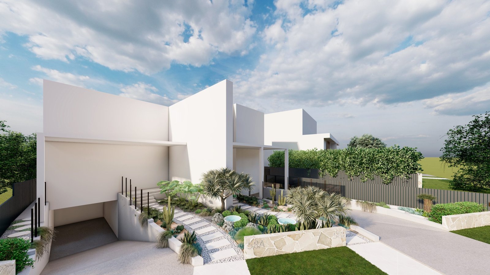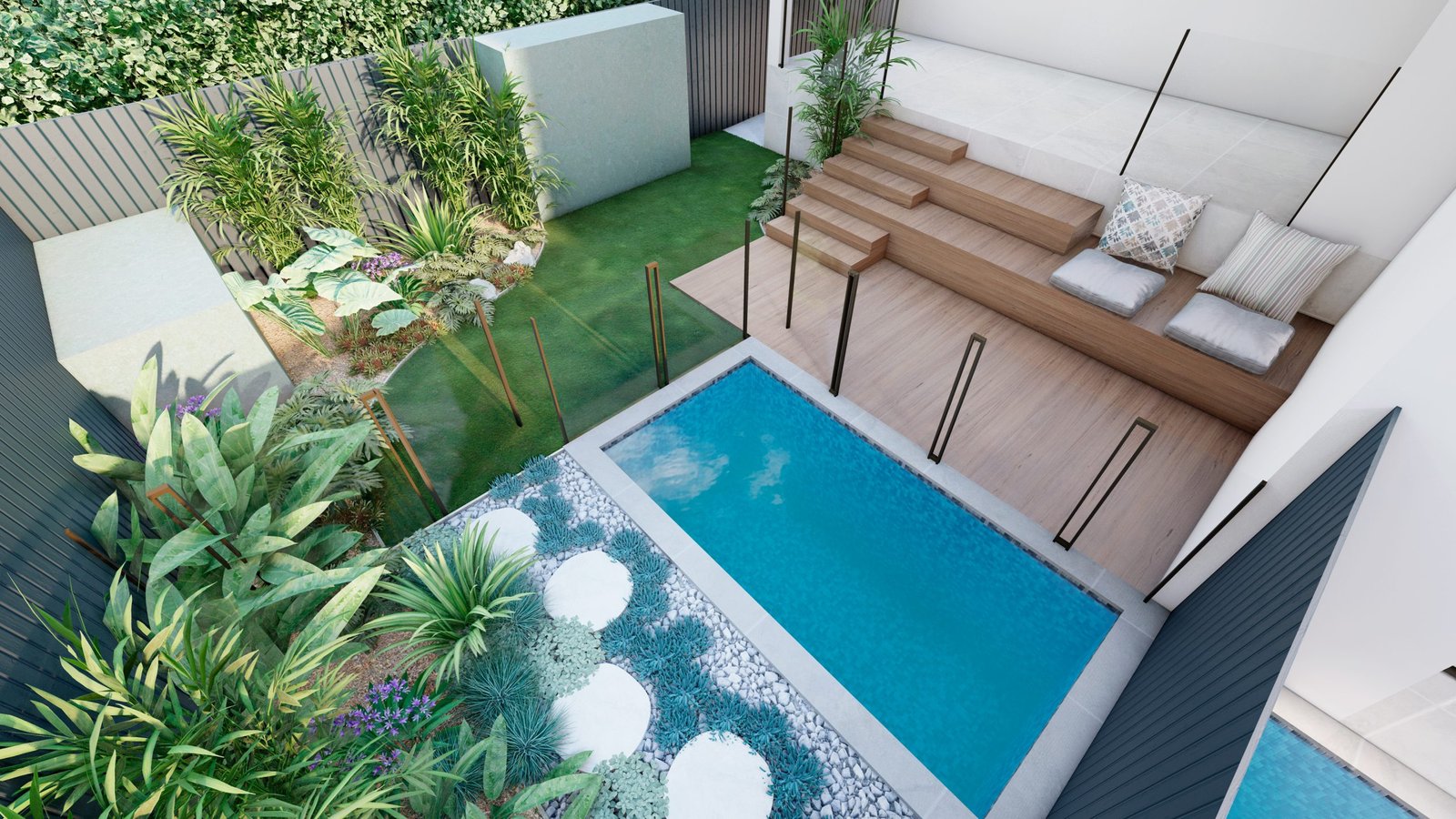 A Mediterranean-inspired duplex landscape that evokes a relaxed resort-like atmosphere with lush tropical planting and warm materiality.
