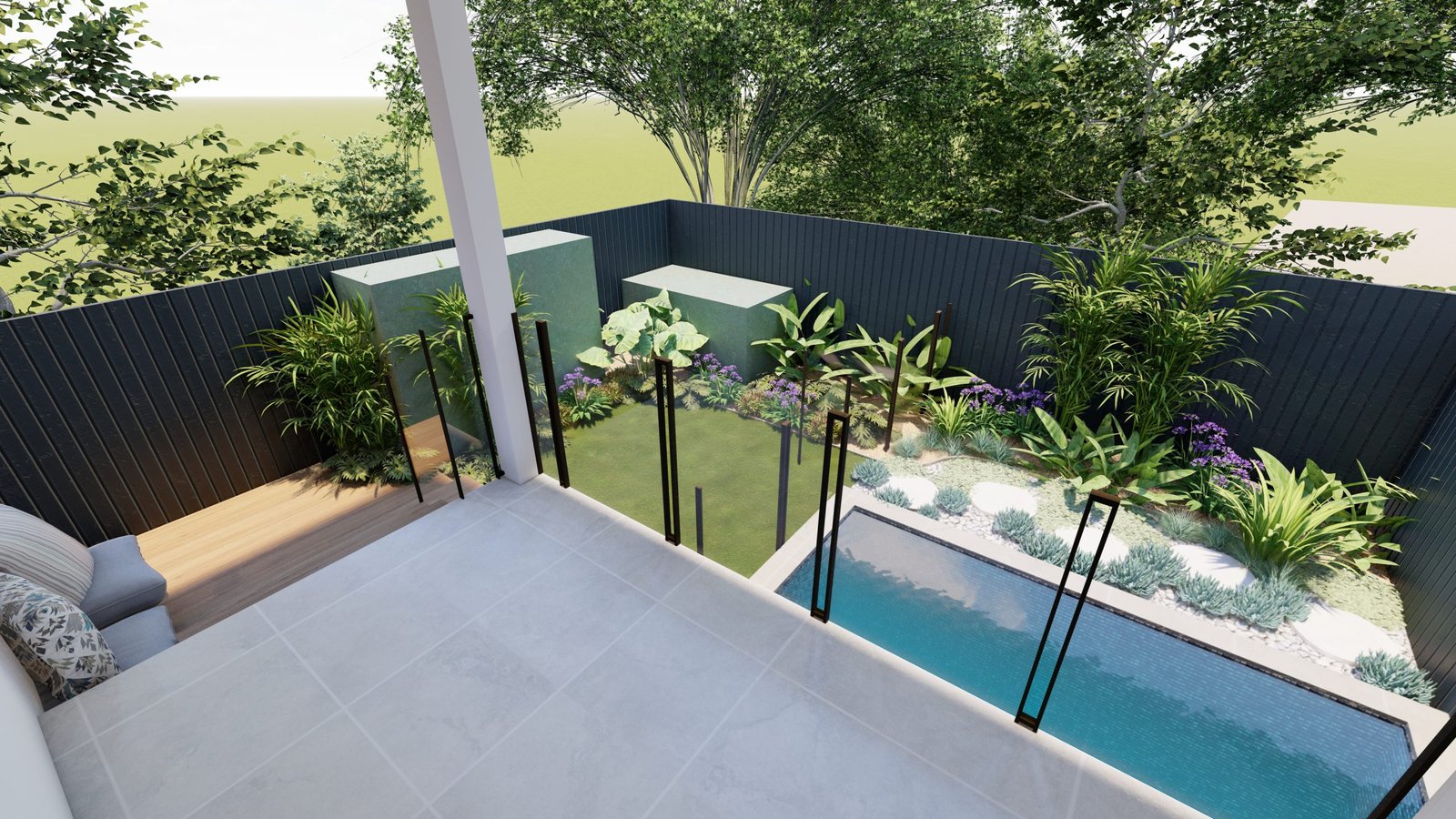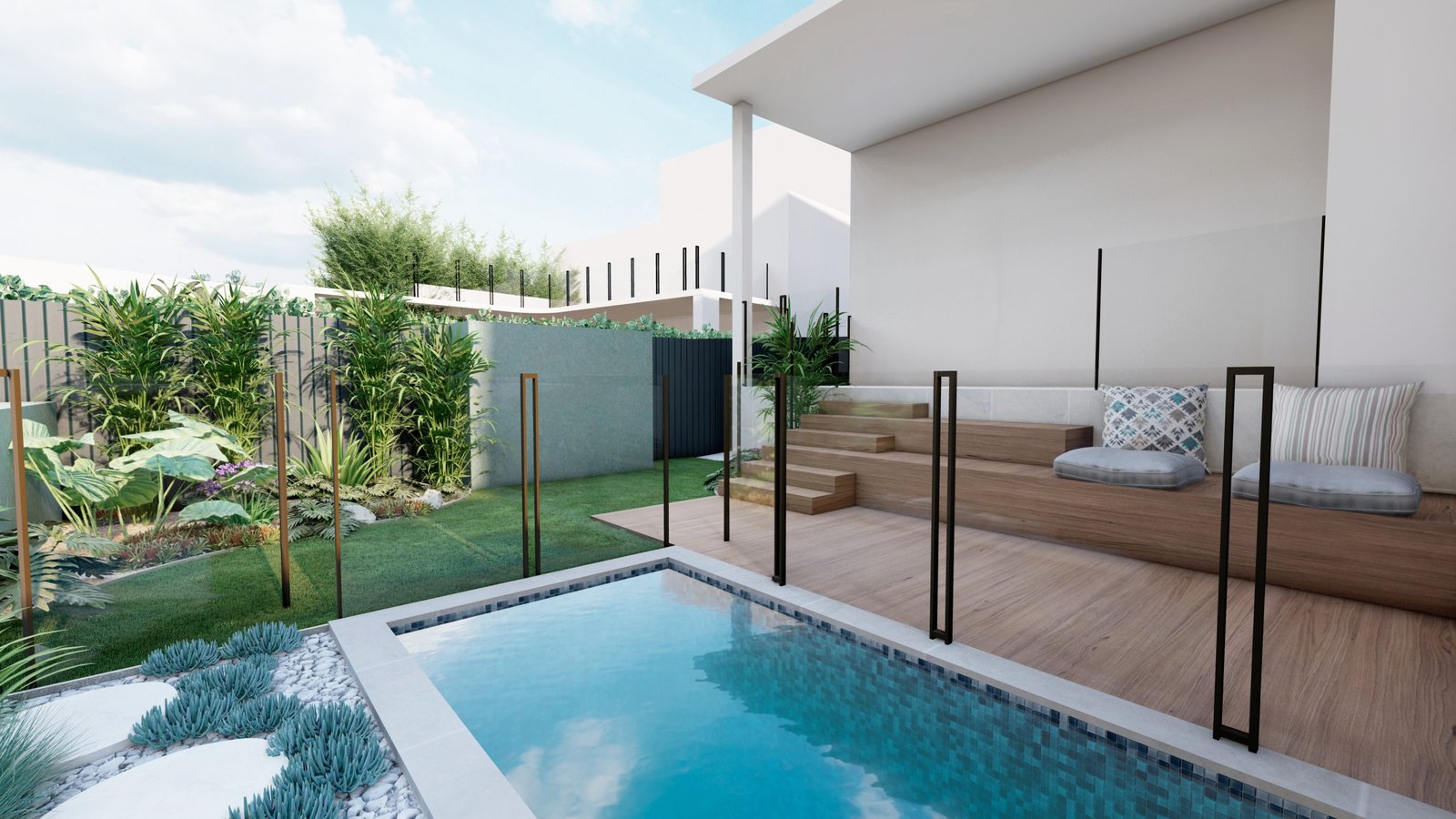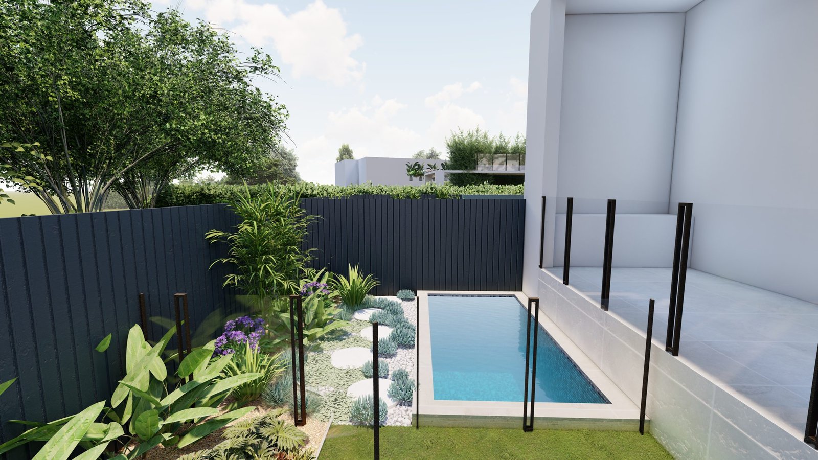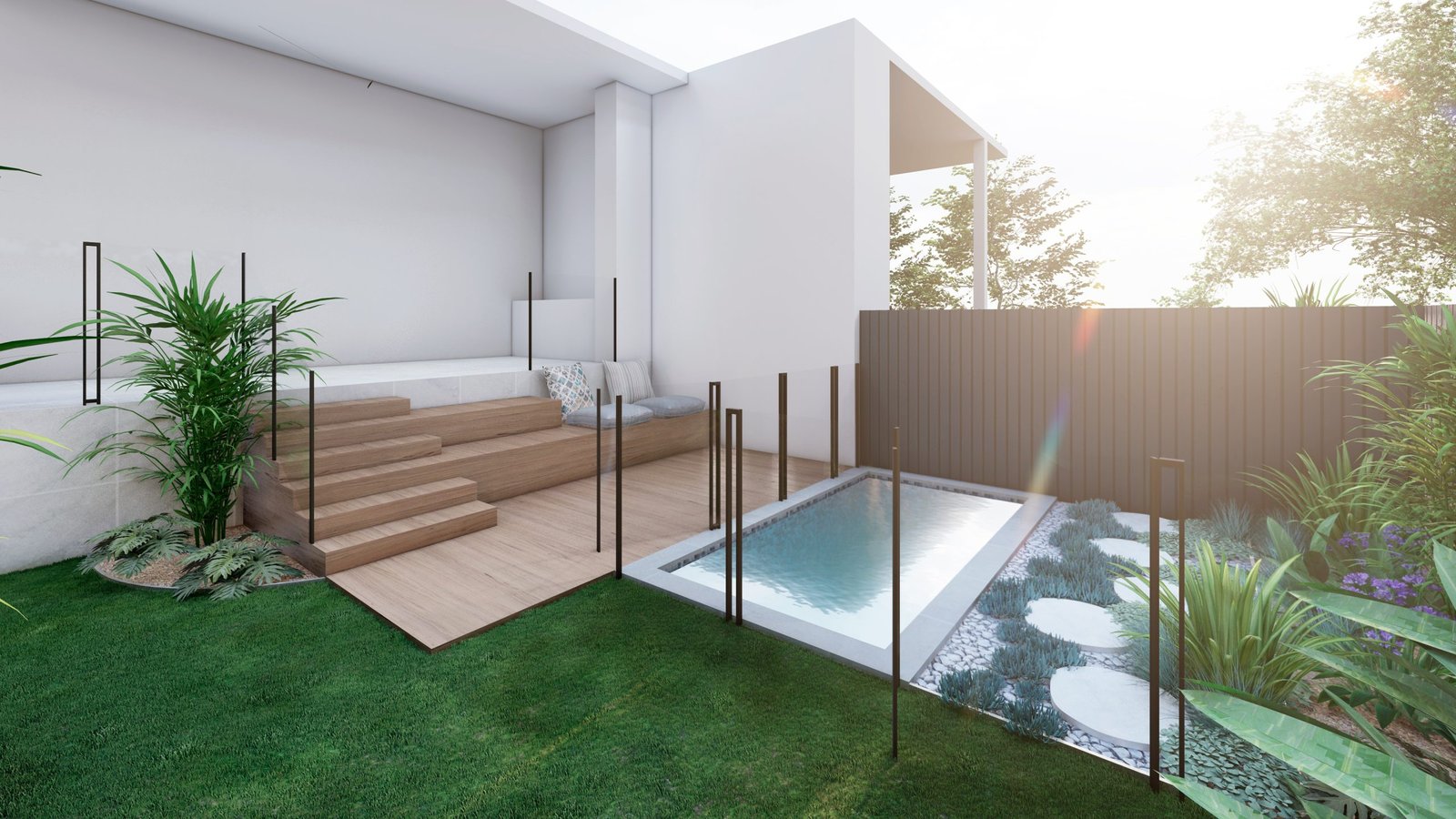 A Mediterranean-inspired duplex landscape that evokes a relaxed resort-like atmosphere with lush tropical planting and warm materiality.
