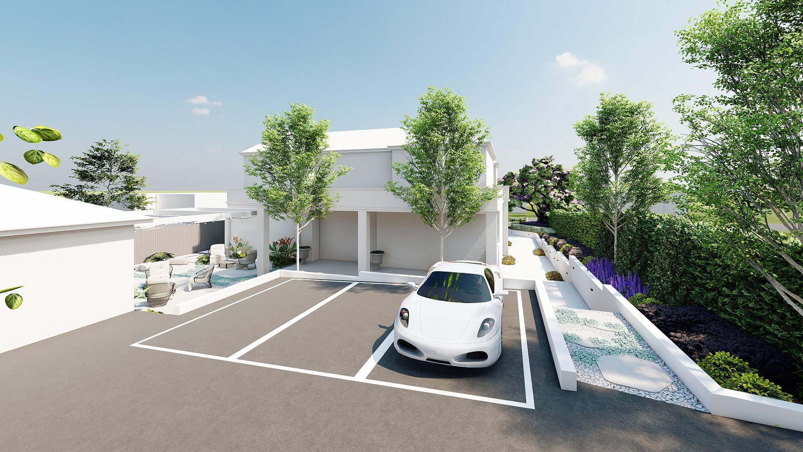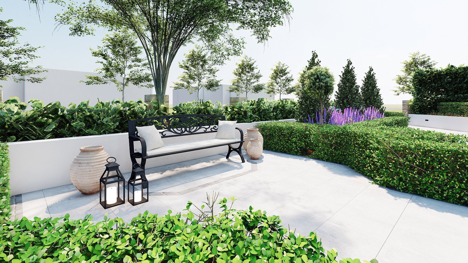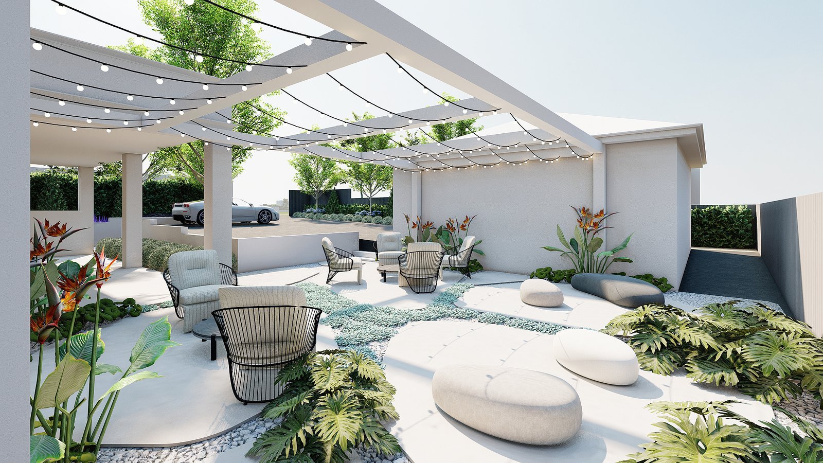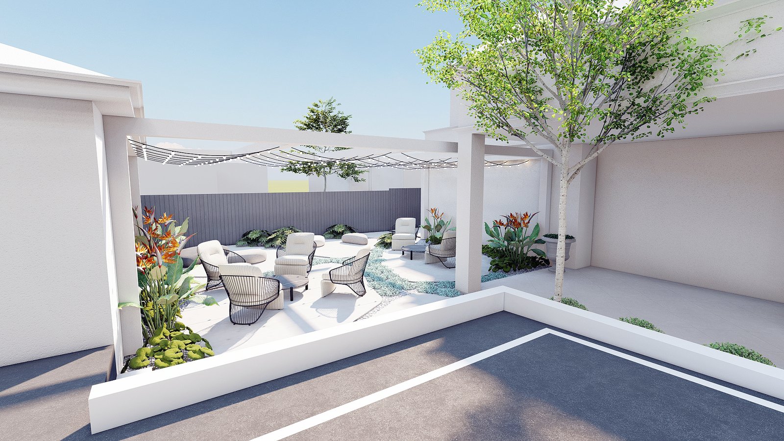 This project interprets a French resort vibe with gentle planting, composed open spaces, and a relaxed garden setting.
