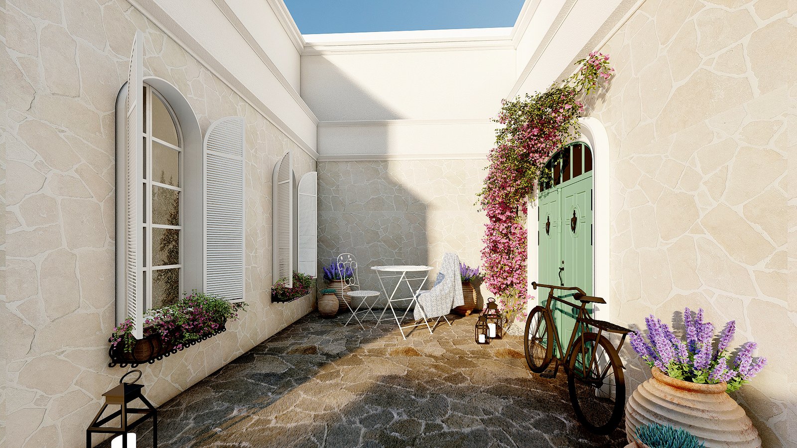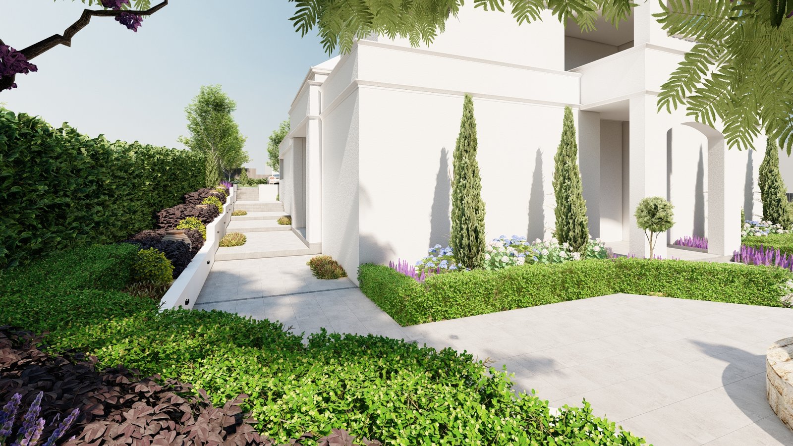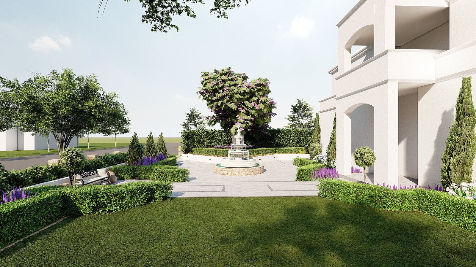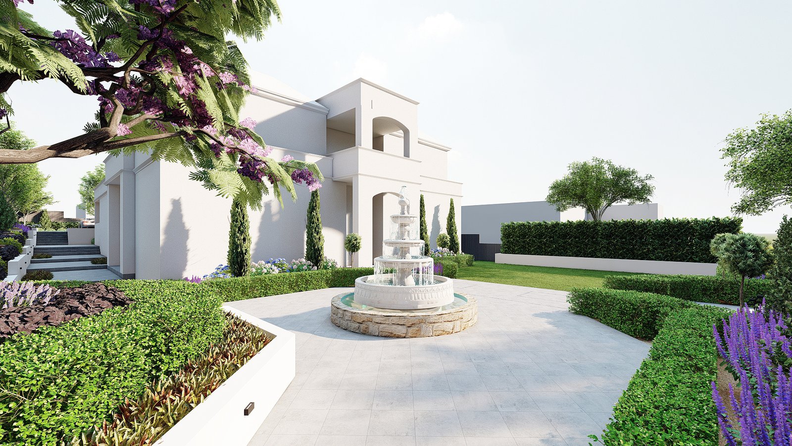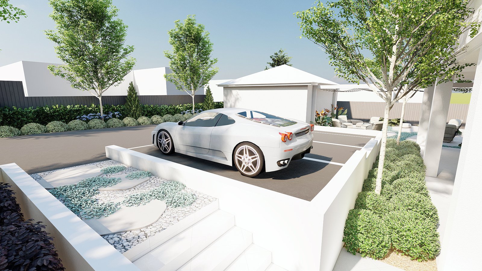 This project interprets a French resort vibe with gentle planting, composed open spaces, and a relaxed garden setting.