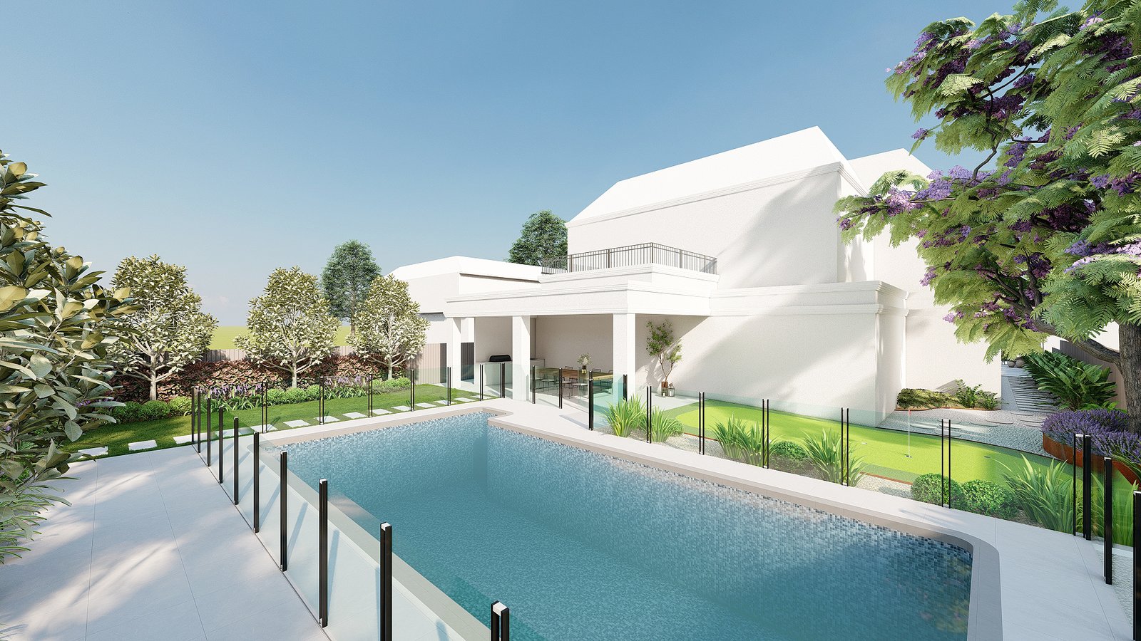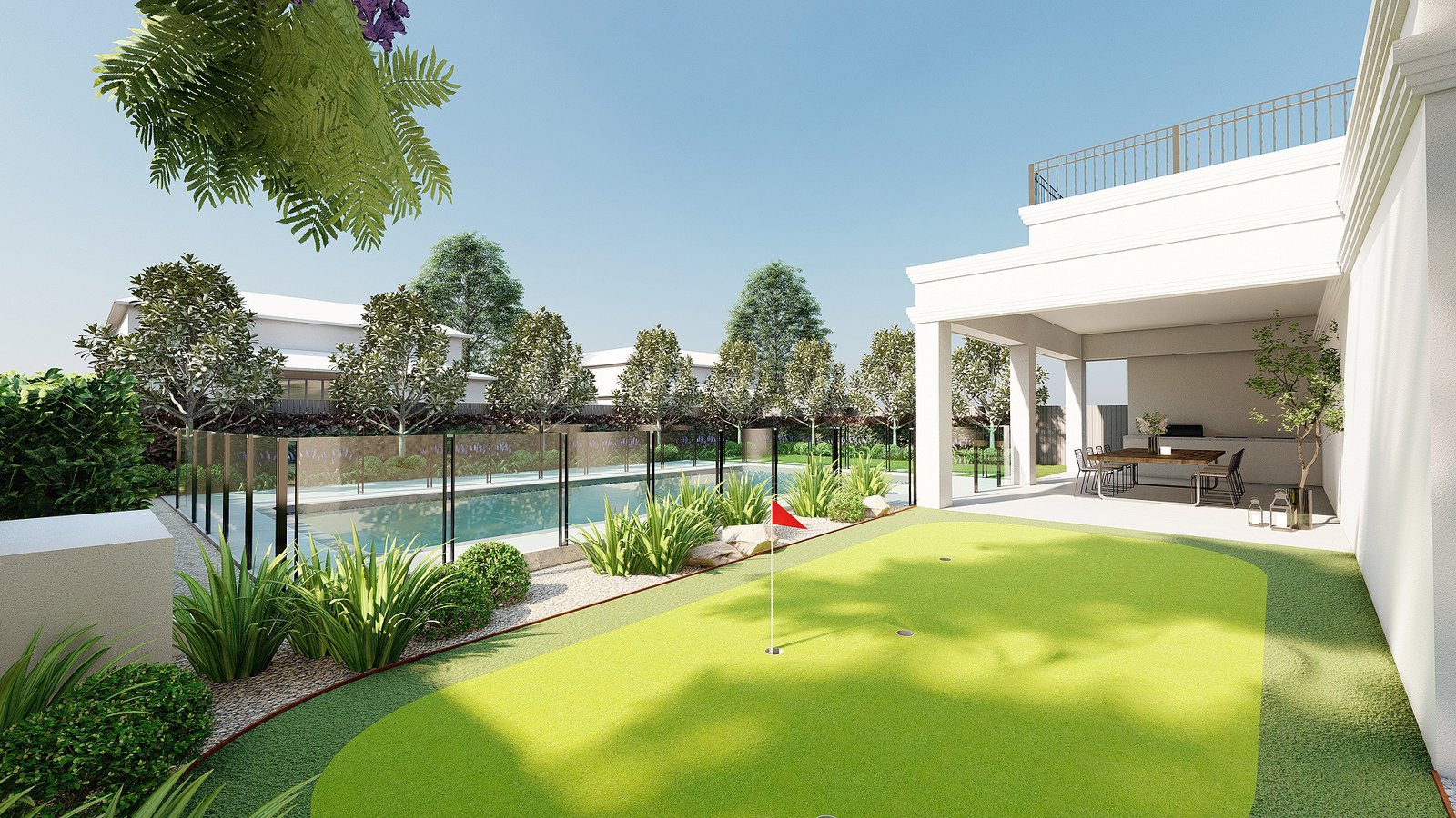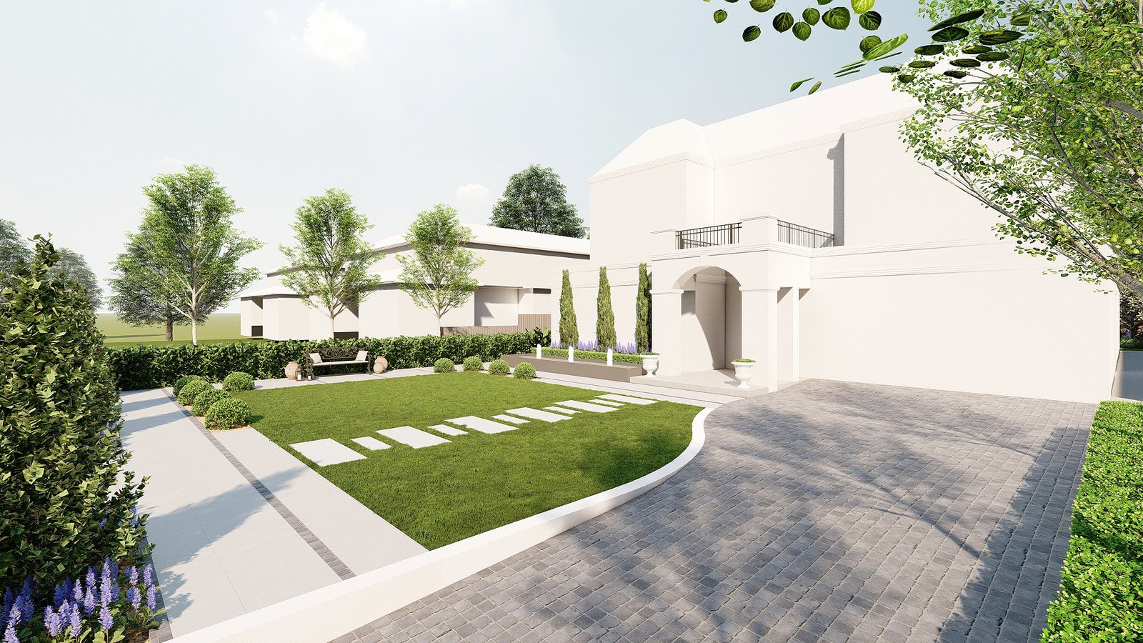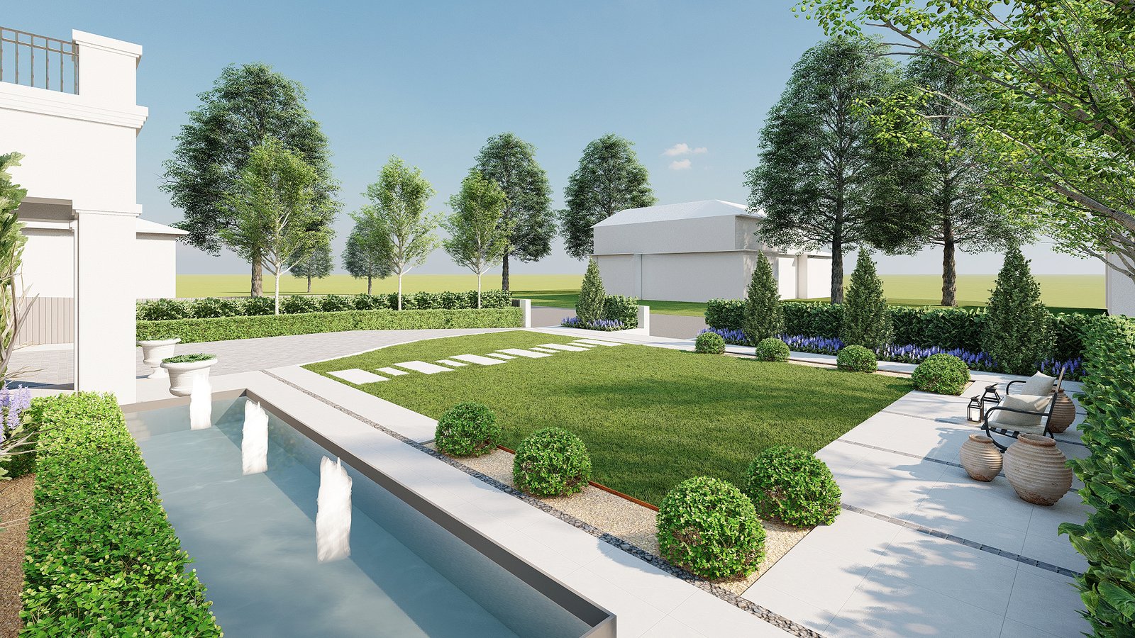 A French-inspired luxury garden in Turramurra that integrates refined outdoor spaces with entertaining and leisure areas for elegant everyday living.